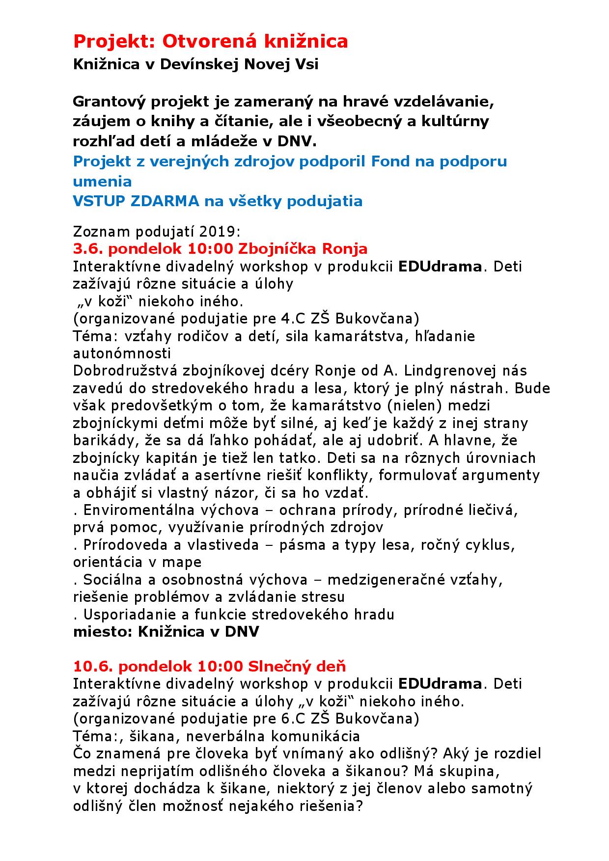 Grantový projekt je zameraný na hravé vzdelávanie, záujem o knihy a čítanie, ale i všeobecný a kultúrny rozhľad detí a mládeže v DNV.