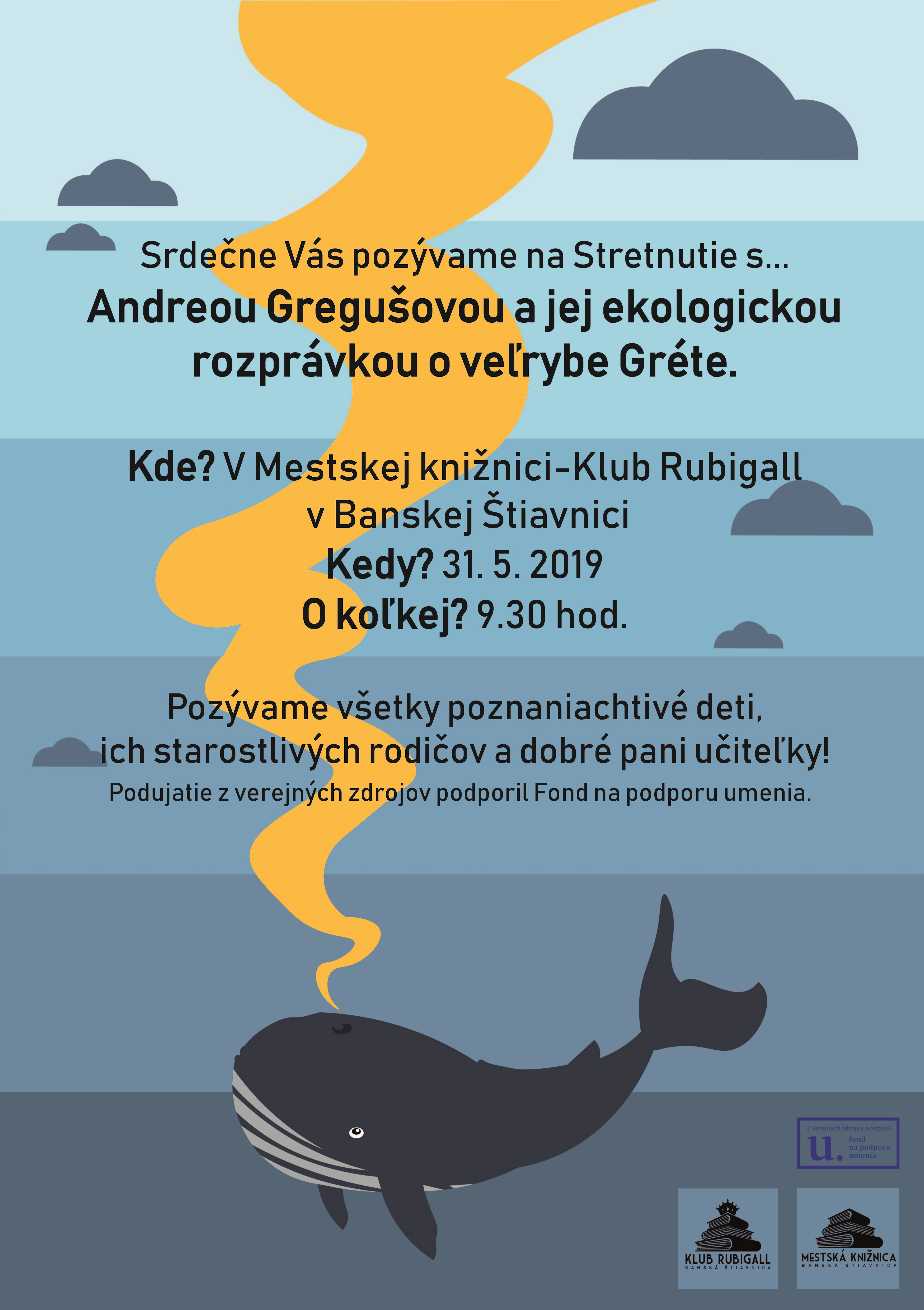 Literárne stretnutie s úspešnou autorkou kníh pre deti a mládež Andreou Gregušovou a jej novým knižným hitom o veľrybe Gréte v Mestskej knižnici v Banskej Štiavnici. Beseda o knihe na podporu čítania a ekologického cítenia detí predškolského veku v novootvorenom Klube Rubigall .
