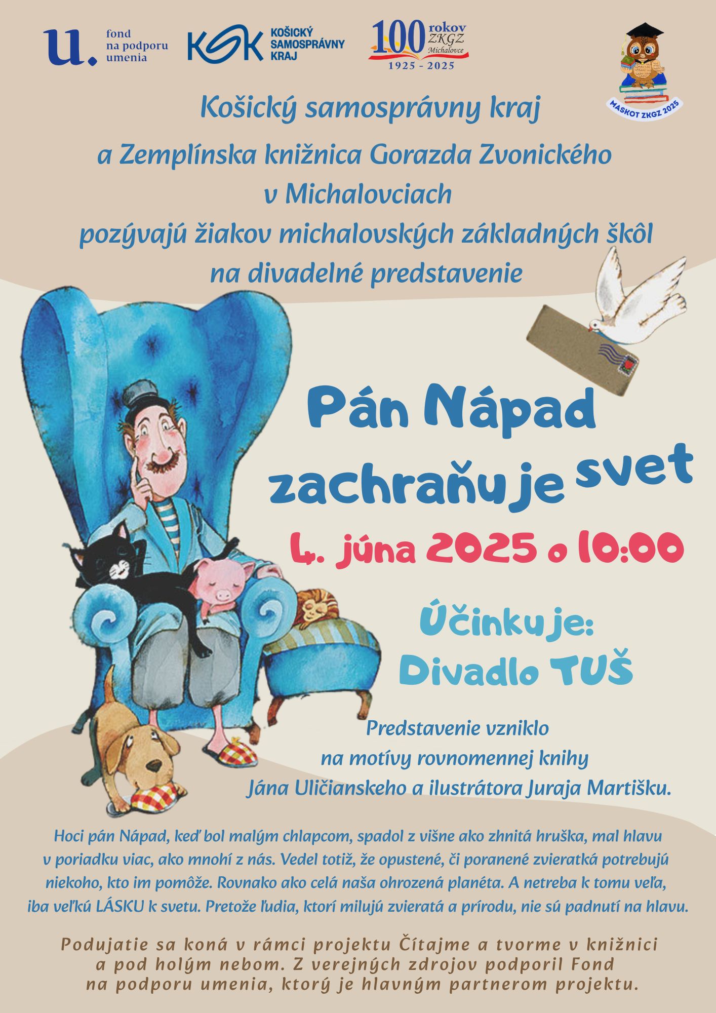 Kto zachráni svet? Možno krása... a možno aj rozprávky! V tomto čarovnom príbehu podľa Jána Uličianskeho spoznáme nevšedného hrdinu – sympatického pána Nápada, ktorý síce na prvý pohľad pôsobí nenápadne, no ukrýva v sebe výnimočný dar. Vďaka čarodejným dverám, bystrému oku, veľkému srdcu a odvahe pomáhať mení svet okolo seba. Predstavenie plné fantázie, humoru a rozprávkového kúzla je určené pre deti základných škôl a ukazuje, že aj nápady môžu byť hrdinské.