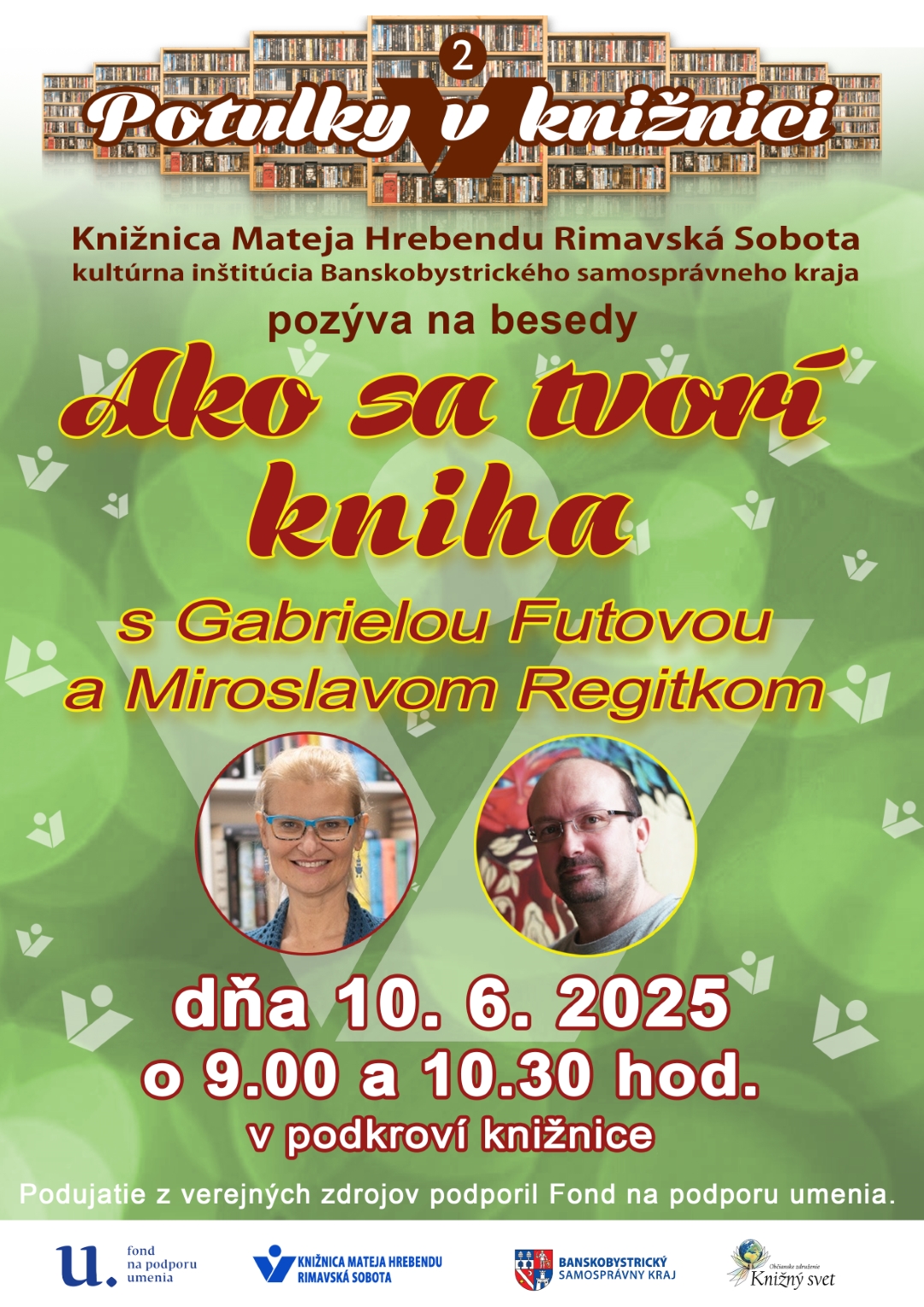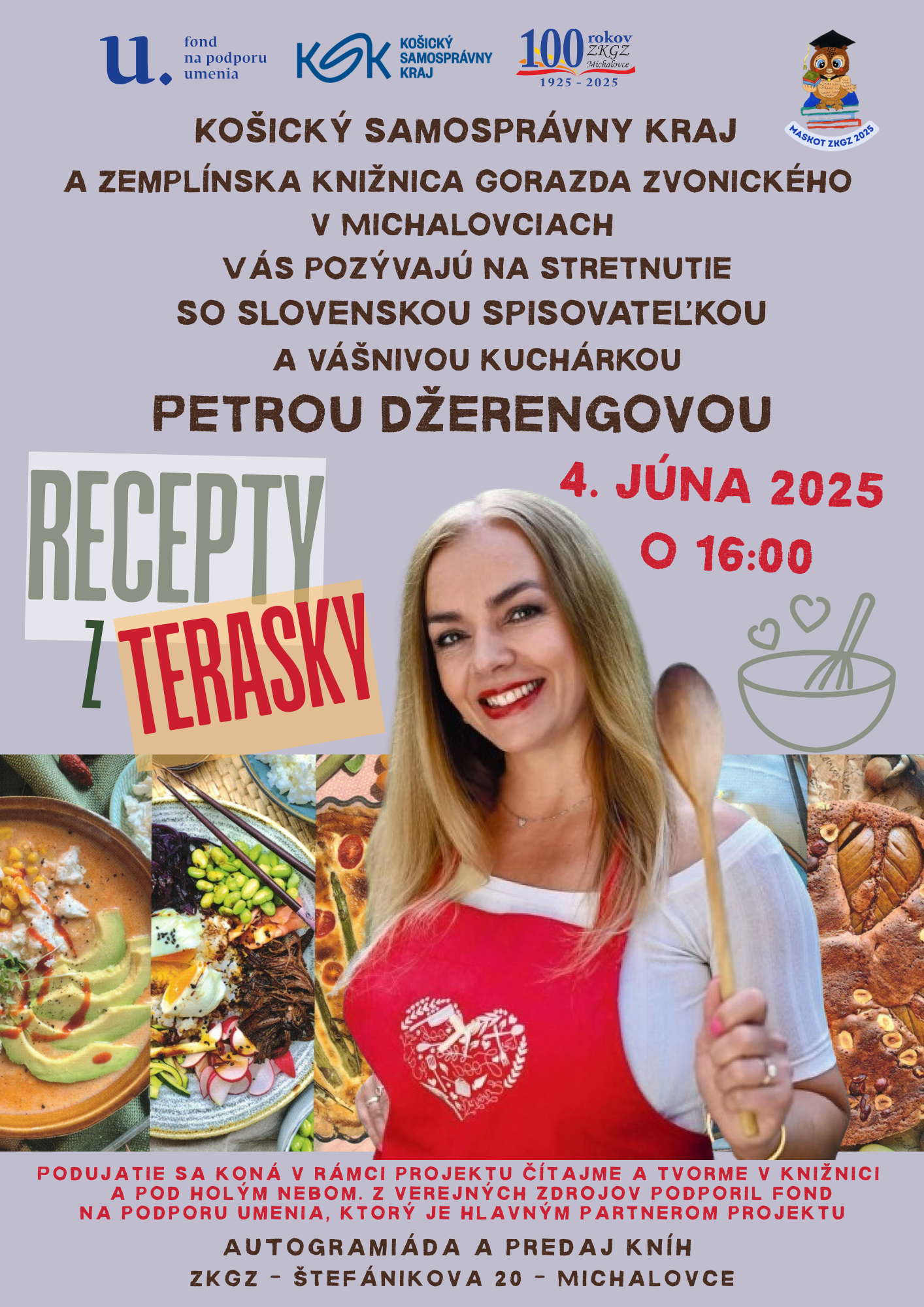 Stretnutie so spisovateľkou Petrou Džerengovou. Autorka predstaví svoju najnovšiu knihu Recepty z terasky, v ktorej sa venuje zdravšiemu stravovaniu a modernizácii tradičných receptov. Petra Džerengová je autorkou 14 kníh pre dospelých aj deti. Venuje sa témam ako vzťahy, sebapoznanie či každodenné výzvy, pričom čerpá z vlastného života. Súčasťou podujatia bude aj autogramiáda.