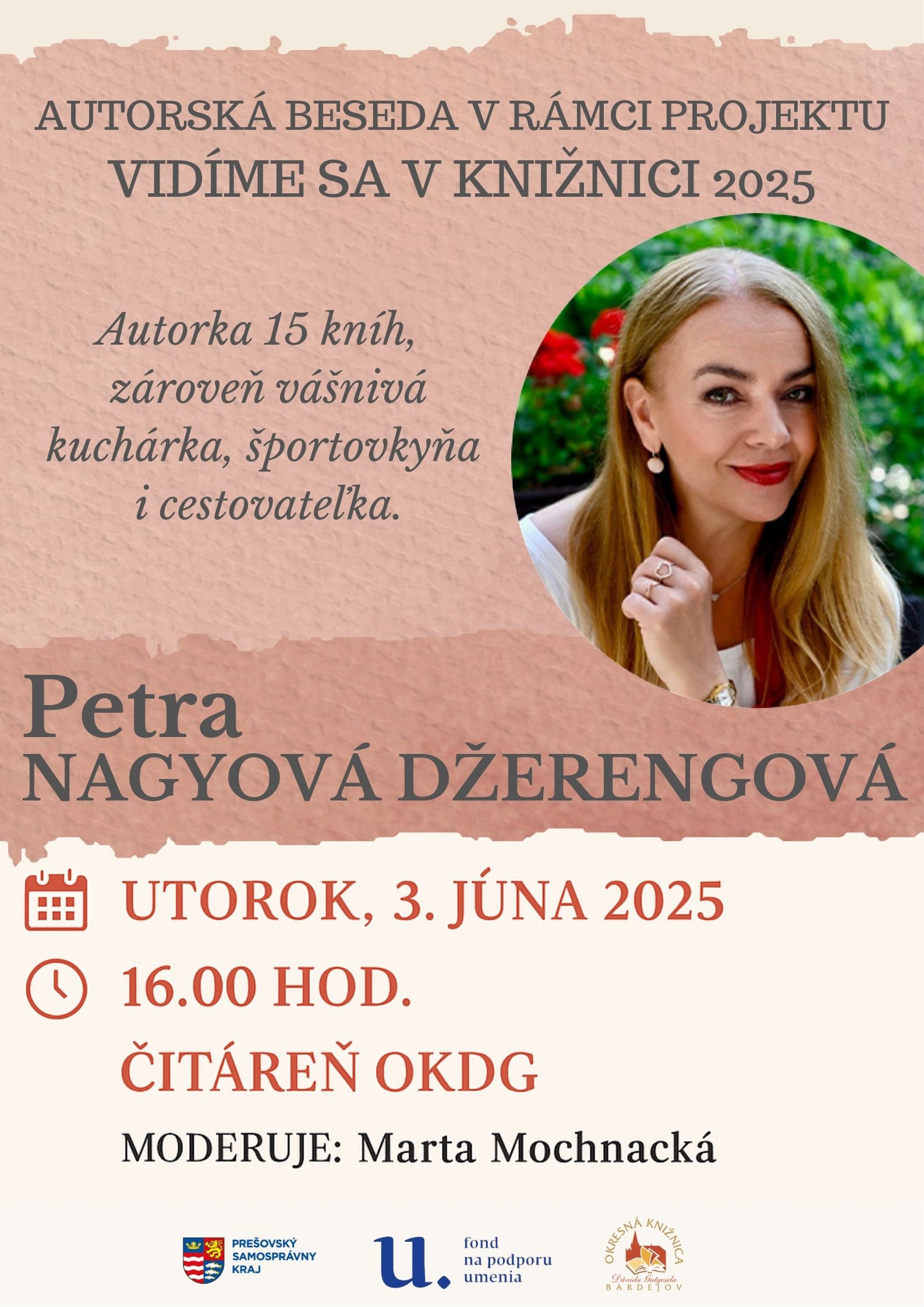 Beseda s jednou z najobľúbenejších slovenských autoriek, Petrou Nagyovou Džerengovou, ktorej knihy oslovujú ženy, matky, deti i mládež. Je známa svojou otvorenosťou, humorom a schopnosťou písať tak, akoby čitateľovi rozumela lepšie než on sám.