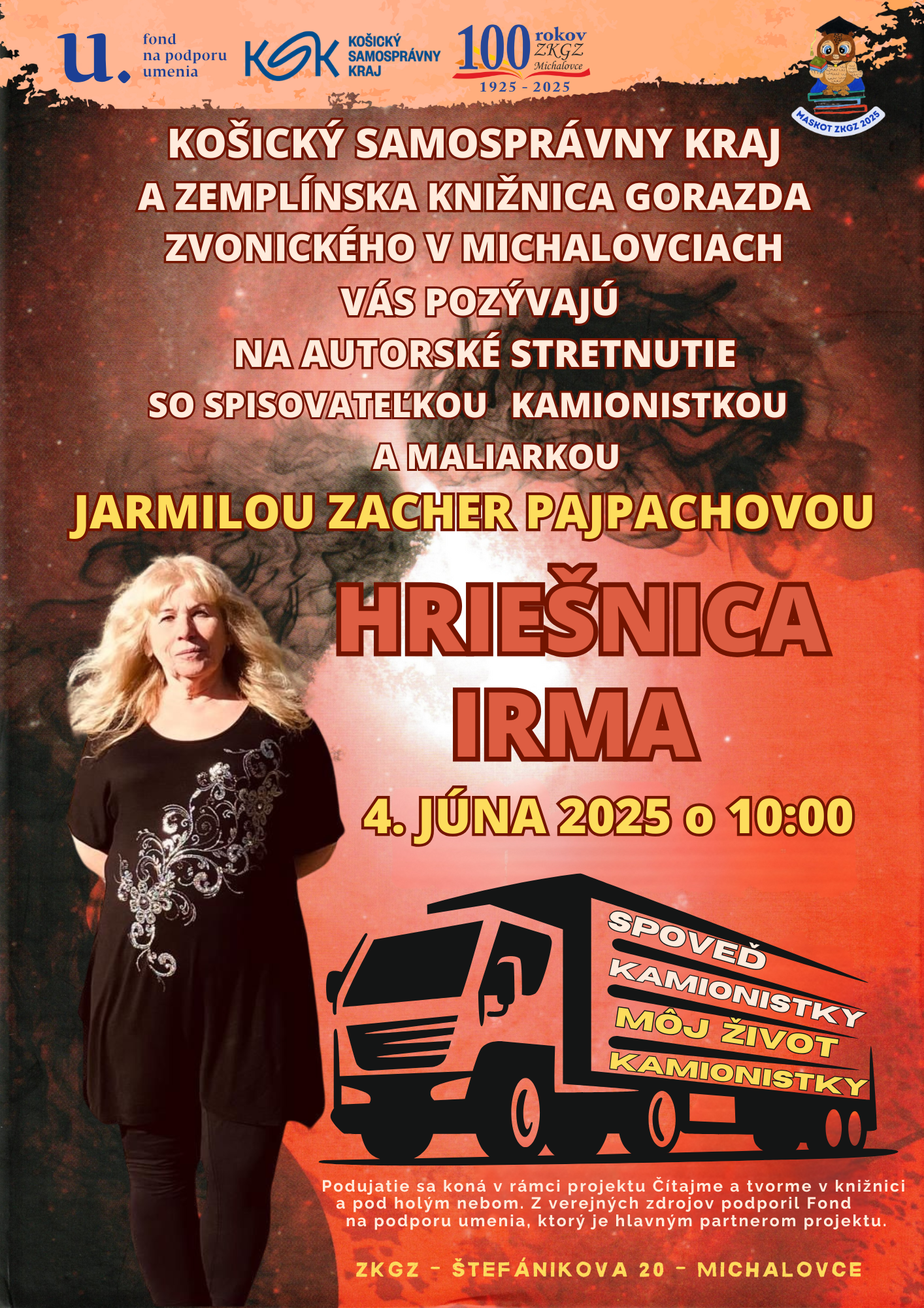 Stretnutie so spisovateľkou Jarmilou Zacher Pajpachovou, autorkou kníh Môj život kamionistky, Spoveď kamionistky či najnovšieho románu Hriešnica a Kajúcnica Berta. Jej písanie vychádza z ťažkých životných skúseností, ktoré premenila na silné príbehy. Vo veku 55 rokov sa stala kamionistkou a získala slovenský rekord. Stále je aktívna, píše, maľuje a inšpiruje svojím odhodlaním a životným príbehom.