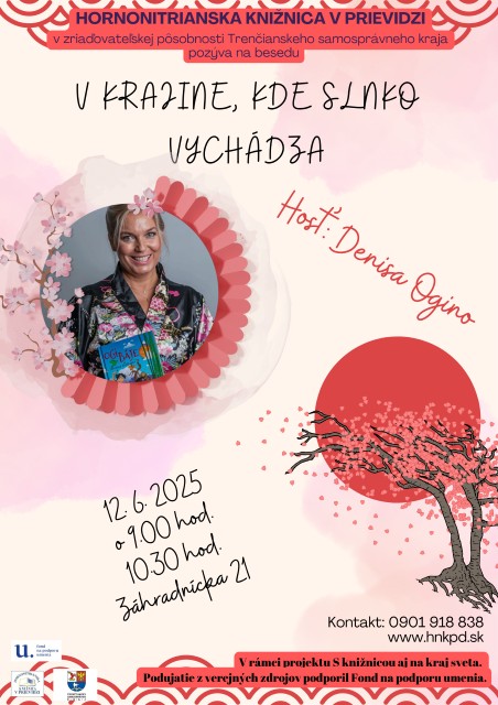Besedy s Denisou Ogino sú plné zaujímavých zážitkov a aktivít, ktoré podnecujú deti k predstavivosti a tvorivosti. Tá v Hornonitrianskej knižnici v Prievidzi bude okrem hovoreného slova o exotickej krajine, doplnená interaktívnymi zážitkami a dokonca si deti vyskúšajú jesť paličkami.