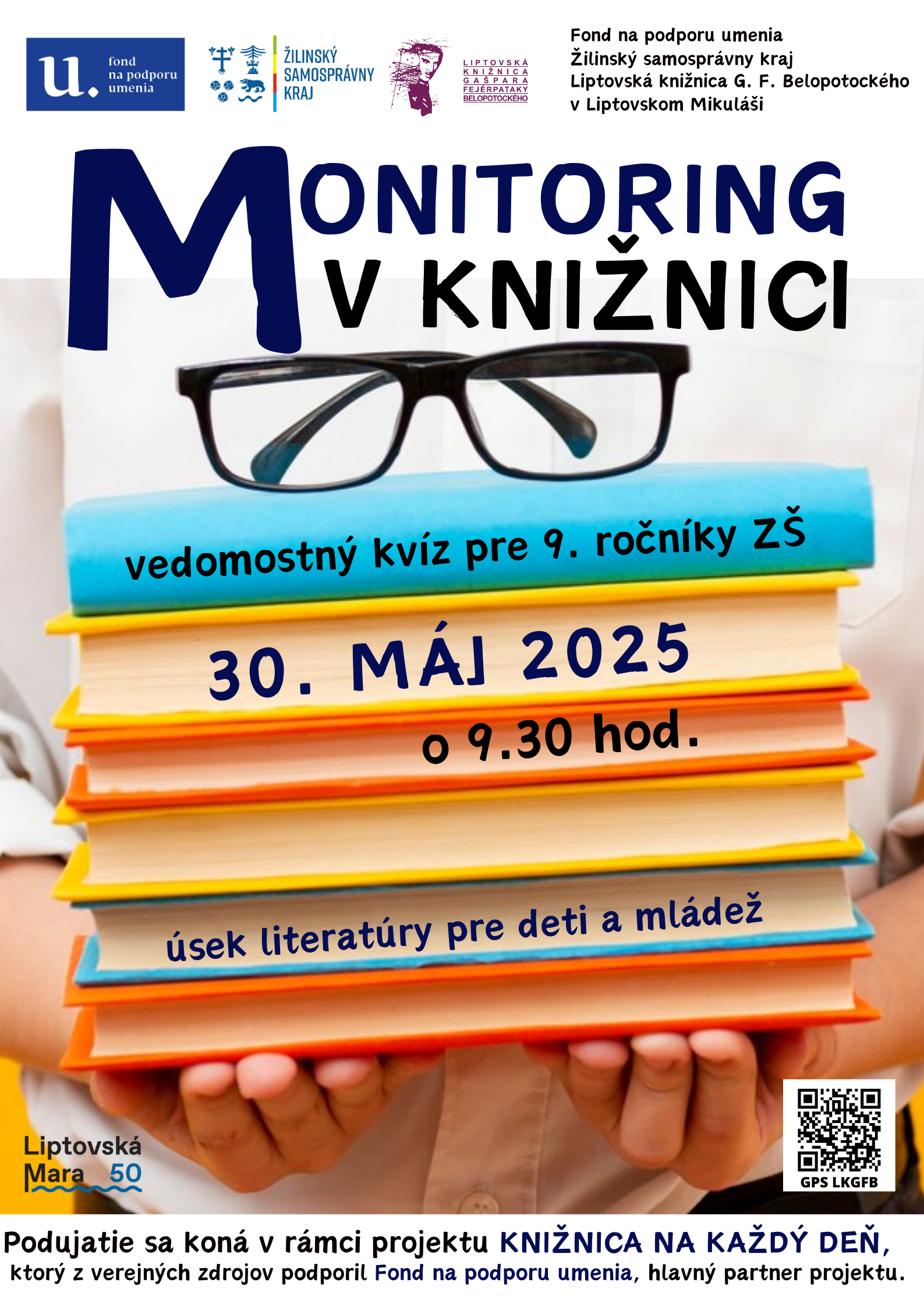 Monitoring v knižnici – vedomostno-súťažný kvíz pre prihlásených žiakov 9. ročníkov ZŠ z Liptovského Mikuláša; 30. máj 2025 od 9.30 hod., v úseku literatúry pre deti a mládež.