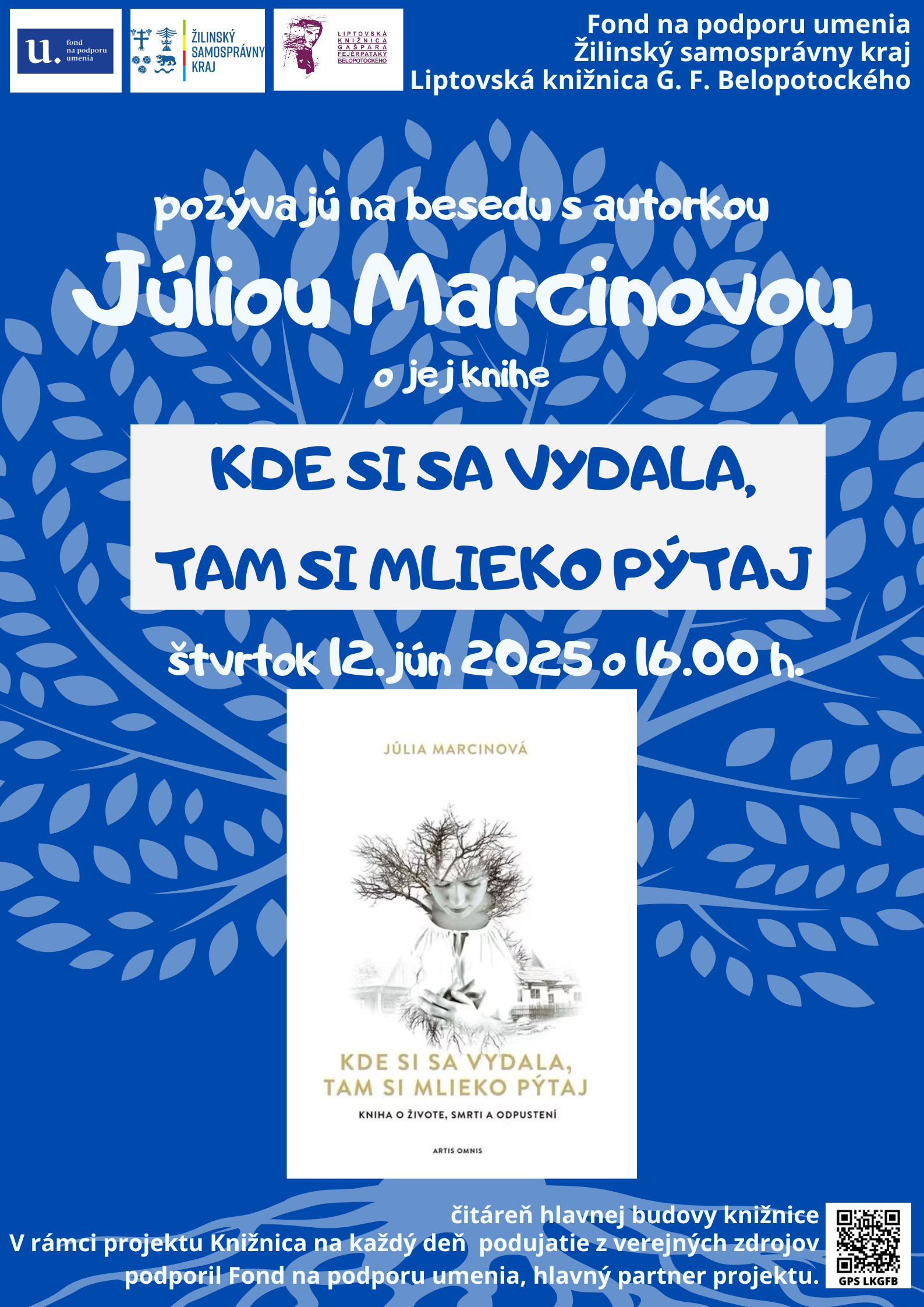 Kde si sa vydala, tam si mlieko pýtaj – autorská beseda Júlie Marcinovej o jej knihe; pre čitateľskú verejnosť; 12. jún 2025 o 16.00 v multimediálnom úseku Liptovskej knižnice GFB