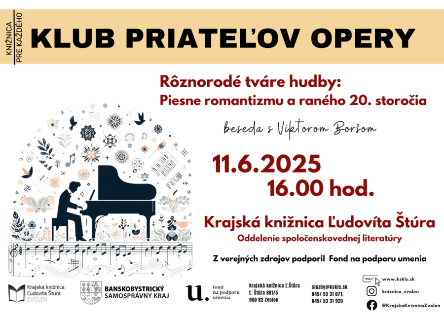 Pozývame Vás na stretnutie Klubu priateľov opery s prednášajúcim Viktorom Boršom. Témou stretnutia bude piesňová tvorba v období romantizmu a raného 20. storočia s dôrazom na národné jazyky.