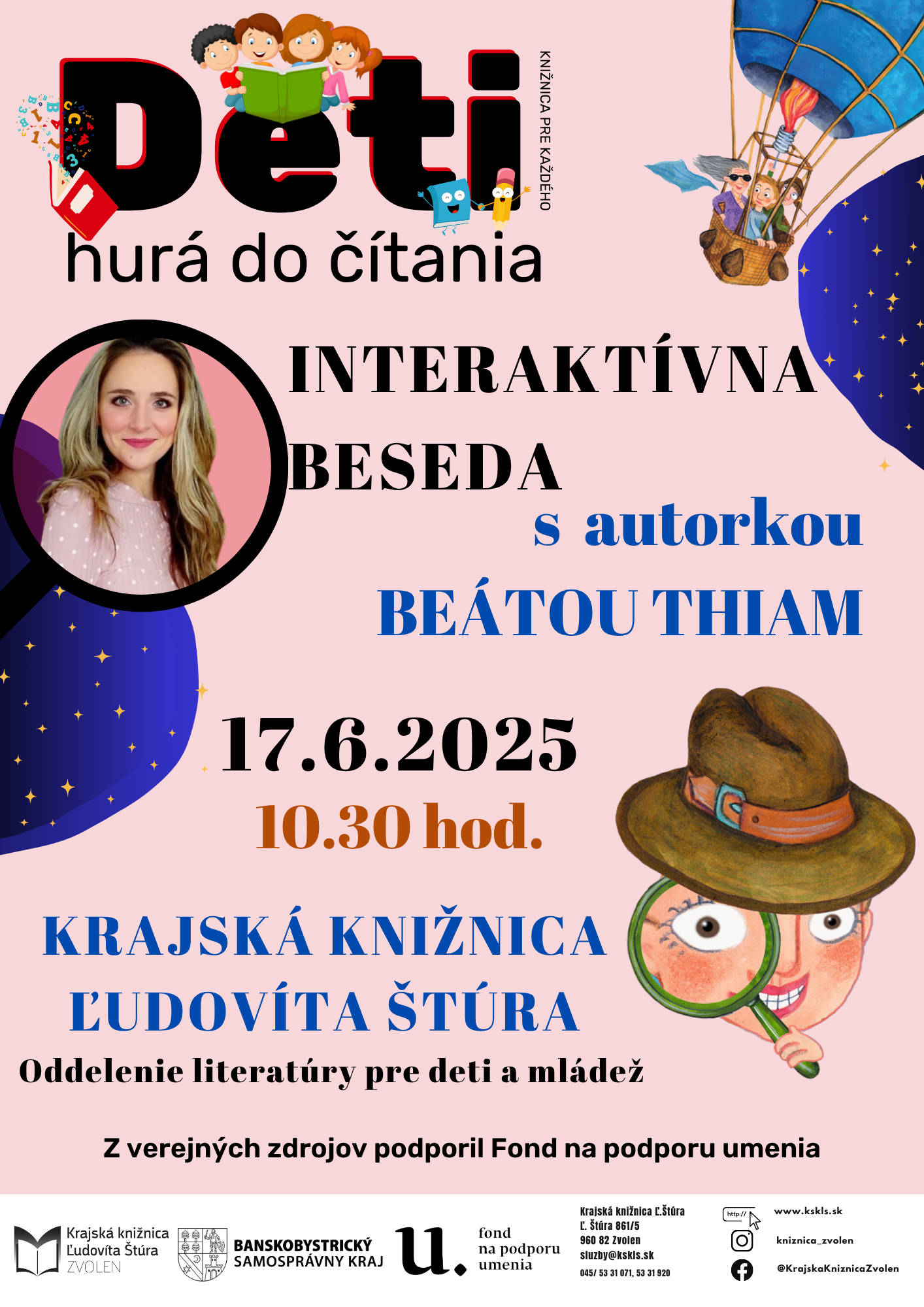 Beseda a workshop so spisovateľkou Beátou Thiam Mészárosovou v rámci cyklu Deti hurá do čítania. Podujatie je určené najmä deťom a pedagógom, ktorí hľadajú inšpiráciu v literatúre a tvorivom vzdelávaní.