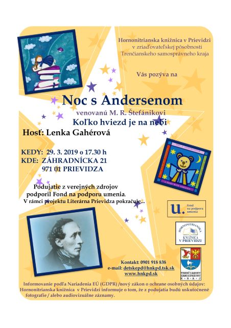 Počas Noci s Andersenom 29. marca 2019 do Hornonitrianskej knižnice v Prievidzi zavíta regionálna spisovateľka Lenka Gahérová. Čo si pre nocľažníkov prichystala zostáva do posledných okamihov tajomstvom.