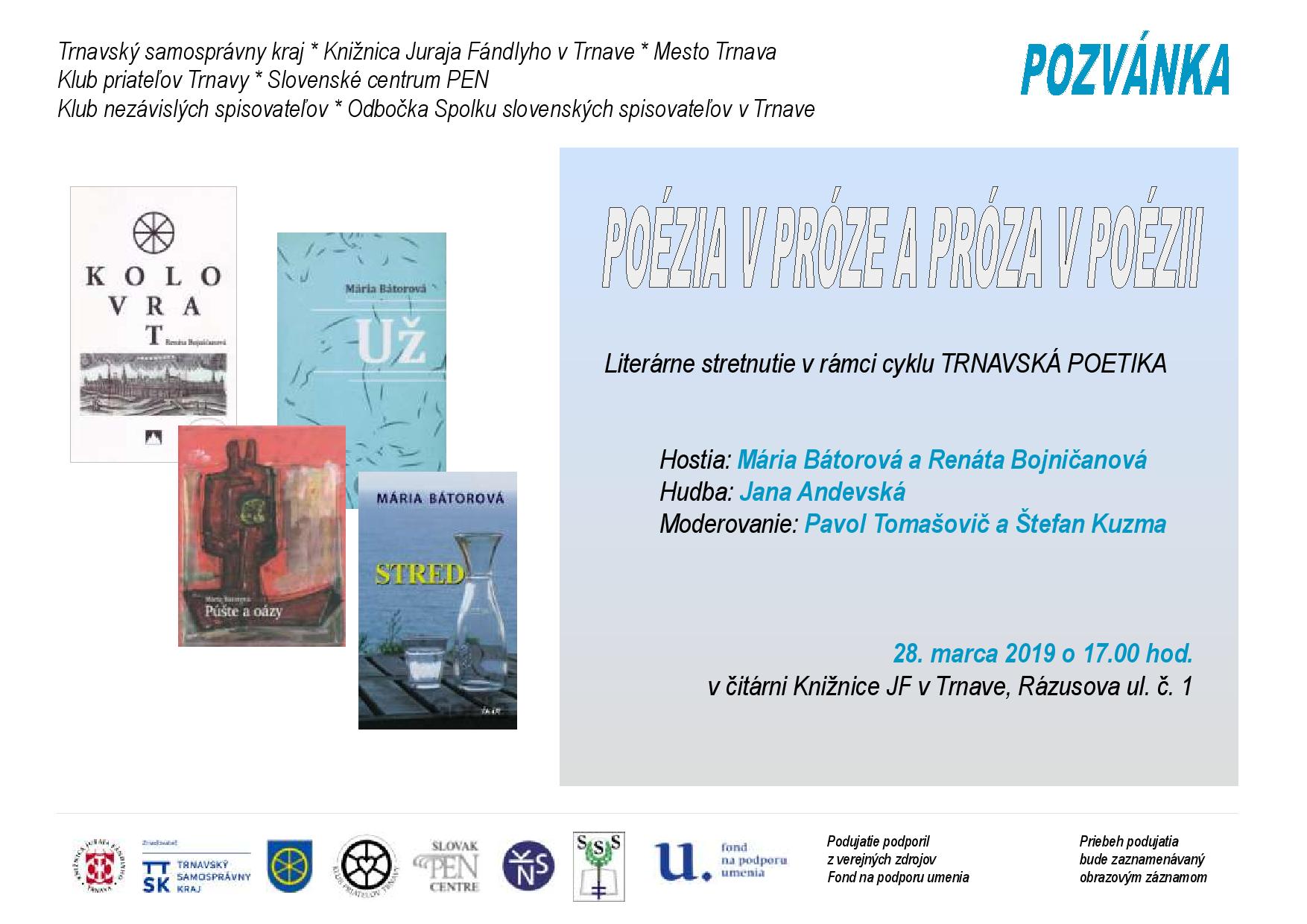 Literárne stretnutie v rámci cyklu Trnavská poetika. Hostia: Mária Bátorová a Renáta Bojničanová, hudba: Jana Andevská. Moderovanie: Pavol Tomašovič a Štefan Kuzma
