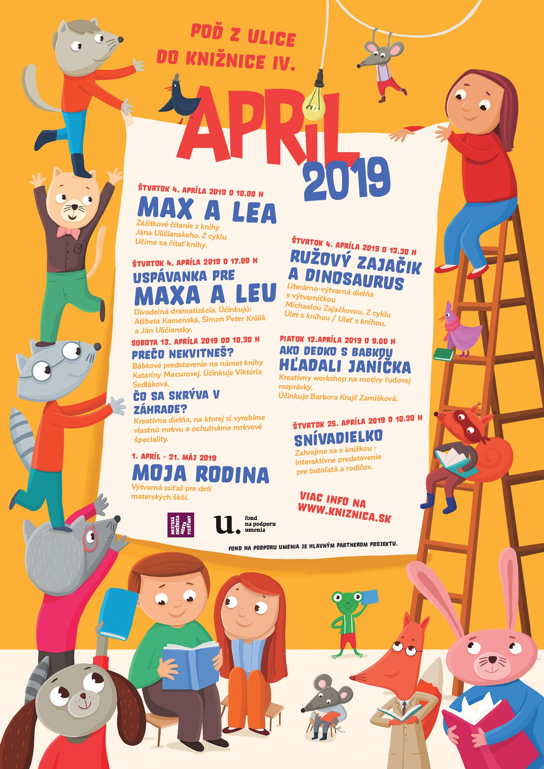 Projektom Poď z ulice do knižnice IV. chceme u detí v predškolskom a školskom veku podporiť osvojenie si čitateľských zručností. V spolupráci s rodičmi a cez zaujímavé aktivity chceme prispieť k budovaniu pozitívneho vzťahu detí ku knihe a položiť základy ich celoživotného vzdelávania. Ústrednými aktivitami sú: cyklus podujatí Zahrajme sa s knižkou, Číta a tvorí celá rodina, Učíme sa čítať knihy, Interaktívne dramatizácie, Úlet s knihou/Uleť s knihou, výtvarná súťaž pre žiakov MŠ a iné.