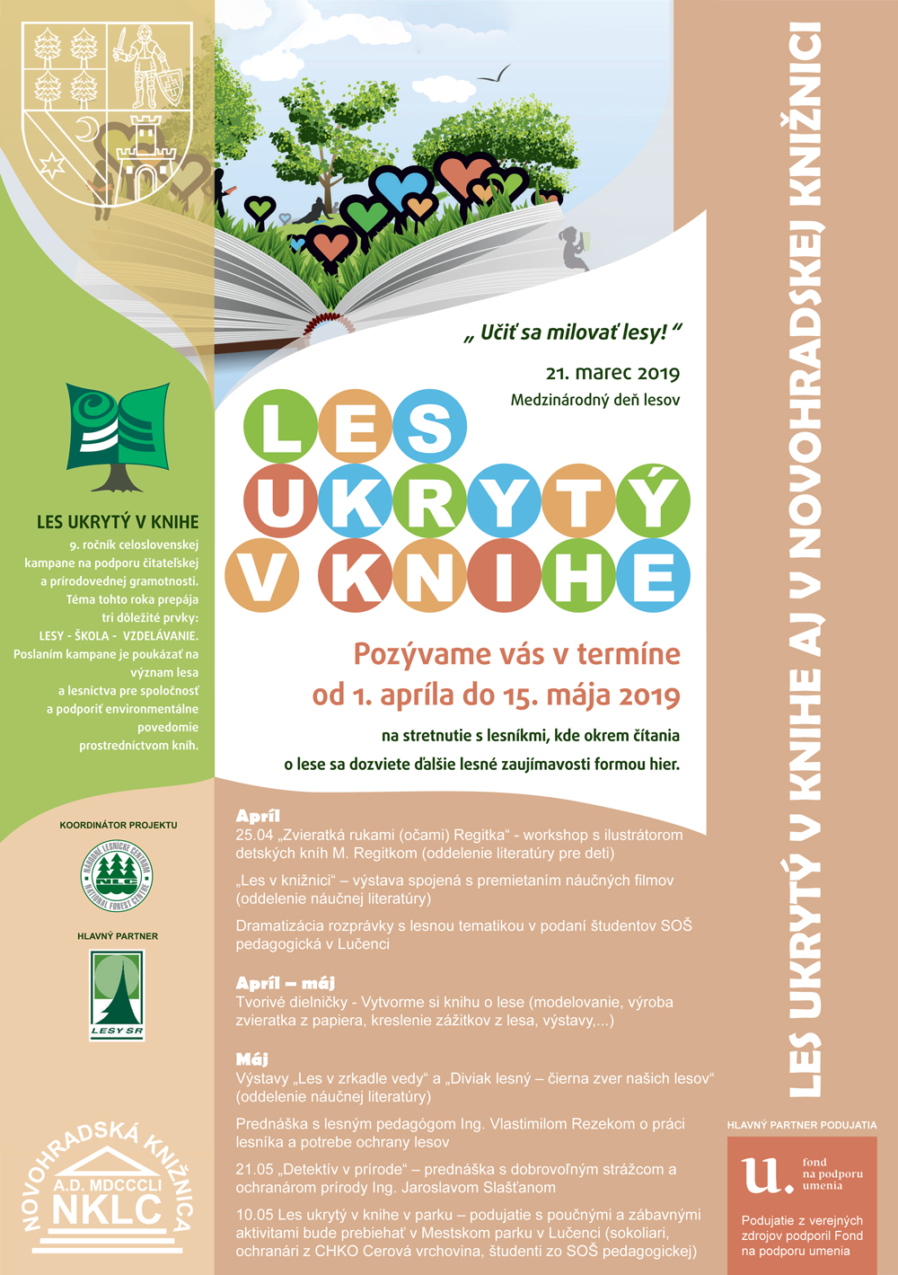 Les ukrytý v knihe v parku - jednodňové podujatie priamo v „lone“ prírody mestského parku má podnietiť rozvoj fantázie, predstavivosti ale aj motorických schopnosti dieťaťa, v rámci príjemných a vzdelávacích aktivít strávených v prírode. Súčasťou podujatia je cyklus podujatí v knižnici - dramatizácia rozprávky o zvieratkách, workshop s ilustrátorom, prednáška s lesným pedagógom, dobrovoľným strážcom, výstavy.