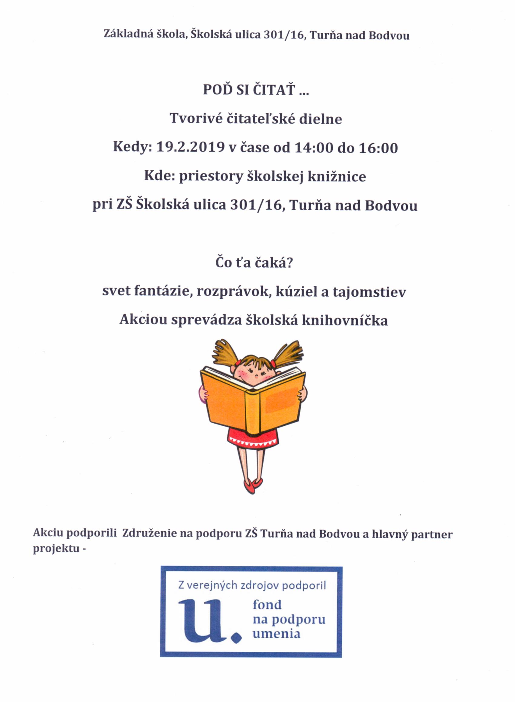 Projekt "Poď si čítať ..." je zameraný na doplnenie knižničného fondu školskej knižnice pri Základnej škole, Školská ulica 301/16, Turňa nad Bodvou. Cieľom projektu bolo doplniť do fondu knižnice atraktívne tituly, ktoré sa dajú využívať v rámci výchovno-vzdelávacieho procesu (encyklopédie, populárno-náučné knihy), v rámci dramatickej výchovy, rozvoja kritického myslenia a rozvoja čitateľskej gramotnosti (rozprávkové knihy, beletria) a na zmysluplné trávenie voľného času (krásna literatúra).