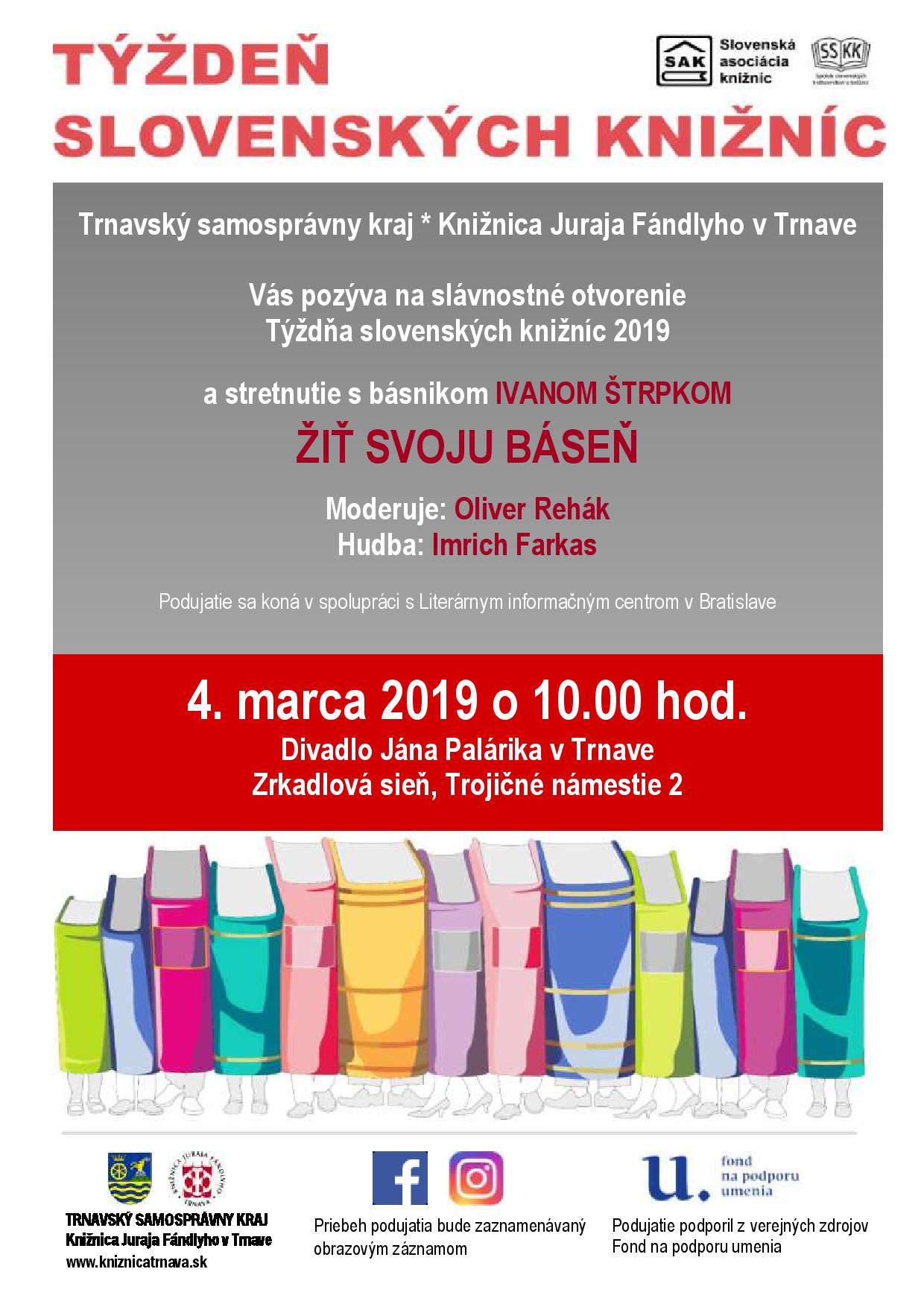 Stretnutie s básnikom Ivanom Štrpkom moderuje Oliver Rehák. Hudba: Imrich Farkas Podujatie sa bude konať 4. 3. 2019 o 10.00 hod. v Zrkadlovej sále Divadla Jána Palárika v Trnave