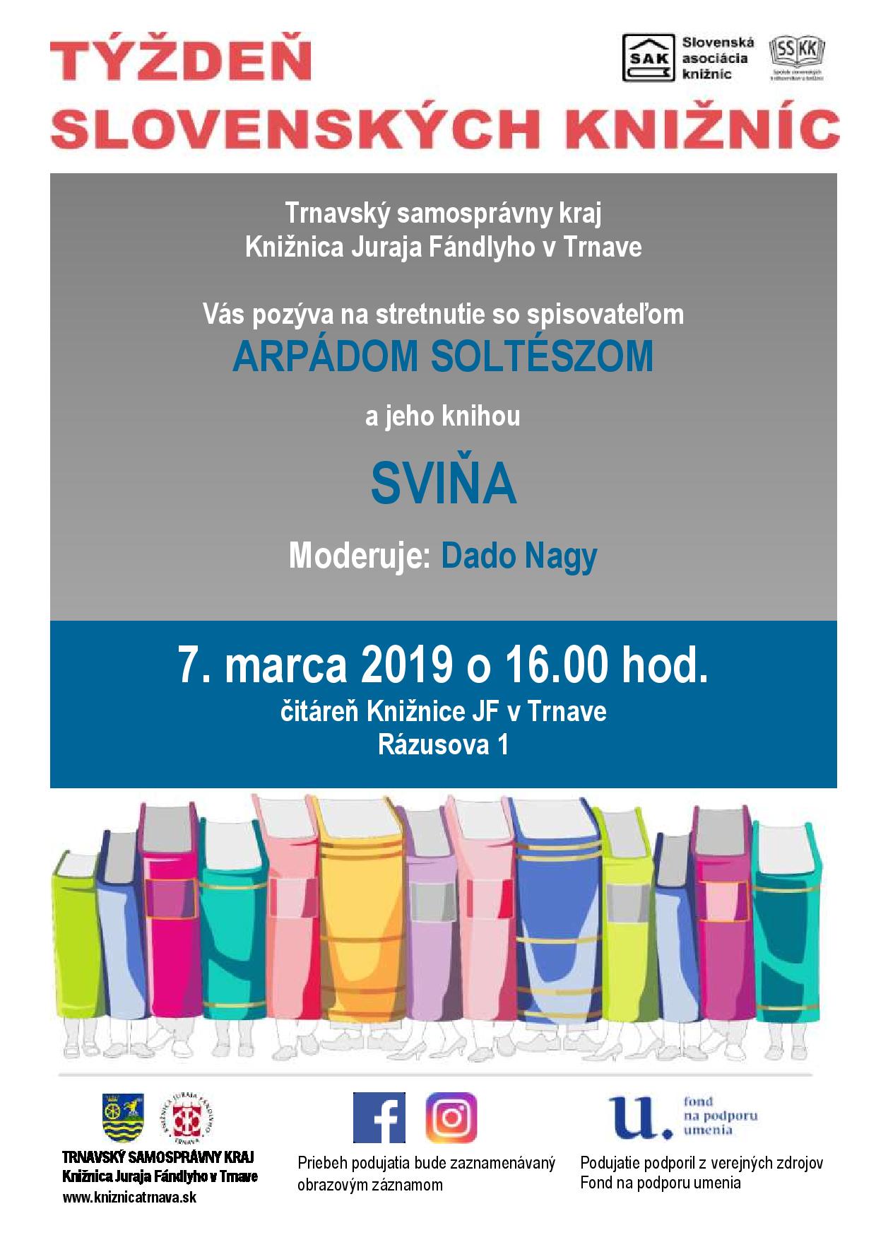 Stretnutie so spisovateľom Arpádom Soltészom a jeho knihou Sviňa moderuje Dado Nagy. Podujatie sa bude konať dňa 7. 3. 2019 o 16.00 hod. v čitárni Knižnice Juraja Fándlyho v Trnave