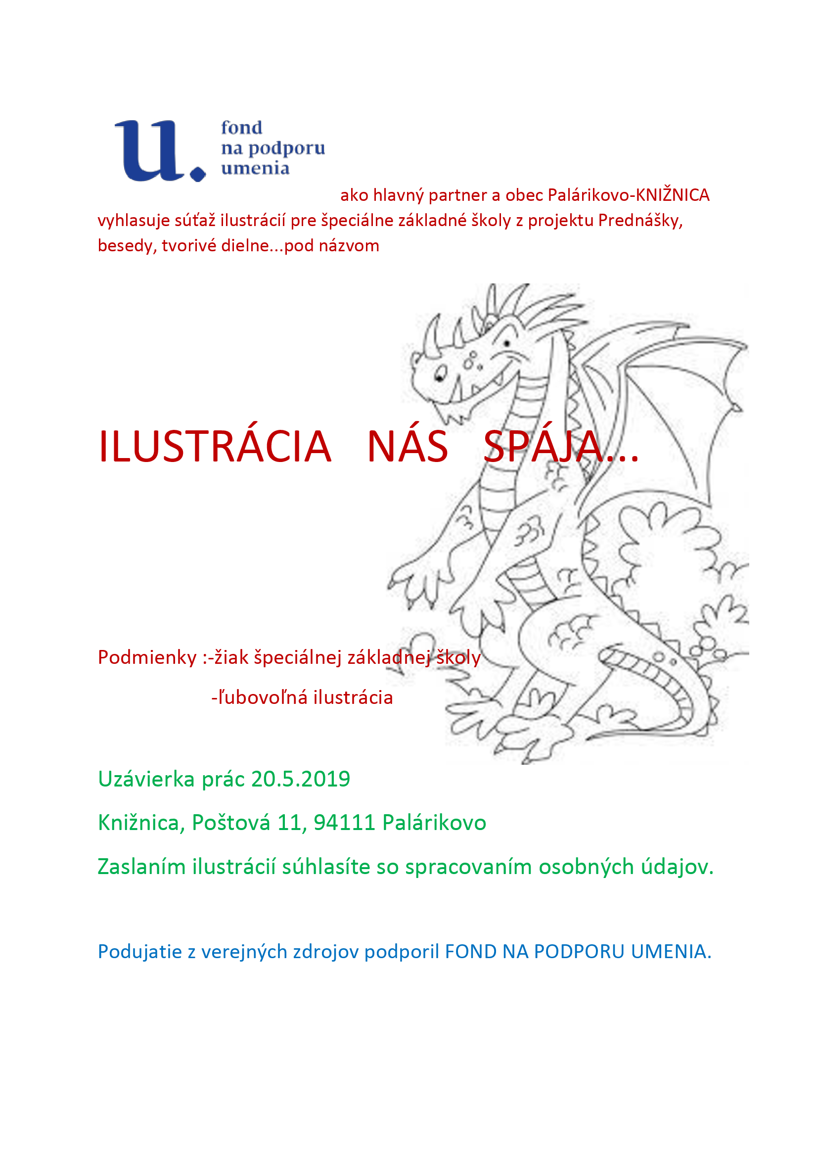 Prednášky, besedy a tvorivé dielne...je názov projektu, ktorý bude prebiehať počas celého roka 2019. , knižnica rozoslala informáciu okolitým špeciálnym školám, aby sa zapojili do súťaže ilustrácií.Do súťaže sa však môže zapojiť žiak hociktorej špeciálnej školy. Uzávierka bude 20.5.2019., následne v mesiaci jún sa uskutoční vyhodnotenie prác za účasti ilustrátora Juraja Martišku.