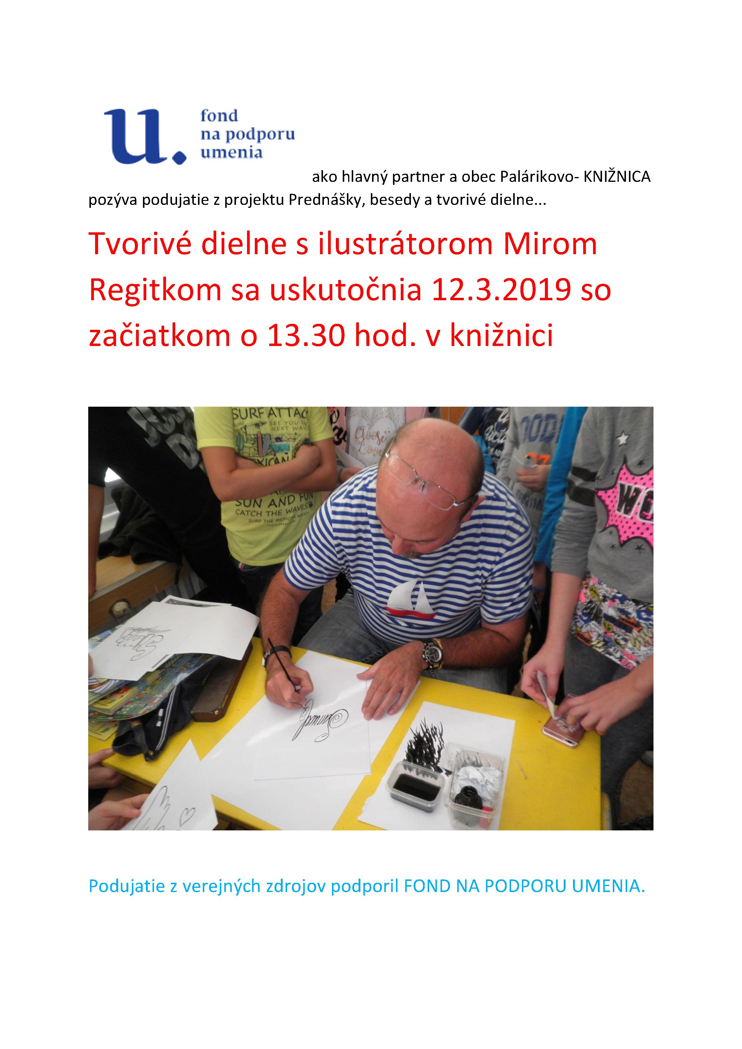 Tvorivé dielne s ilustrátorom Mirom Regitkom sa uskutočnia 12.3.2019 so začiatkom o 13.30 v knižnici.Deti na vlastné oči uvidia jeho tvorbu, lebo keď človek vidí jeho ilustrácie, mnohokrát má pocit, že to sa ani nedá nakresliť.