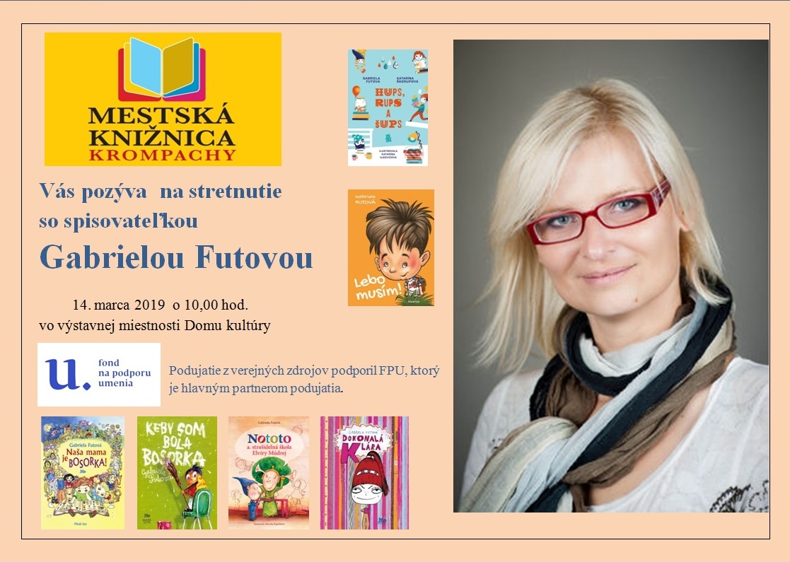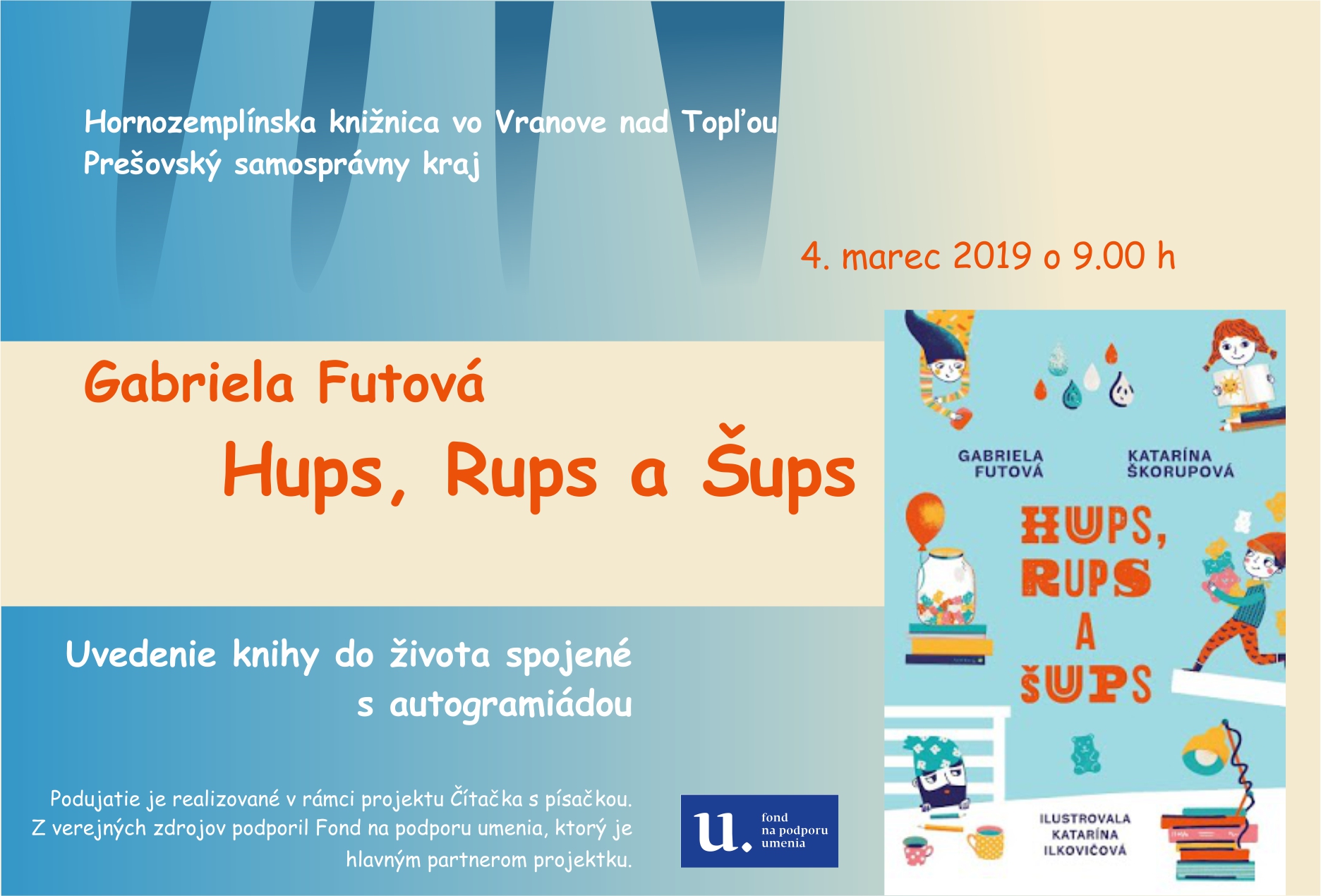 Beseda s obľúbenou detskou spisovateľkou Gabrielou Futovovou spojená s veľkou autogramiádou. V rámci besedy sa bude uvádzať do života jej nová kniha: Rups, šups a hubs