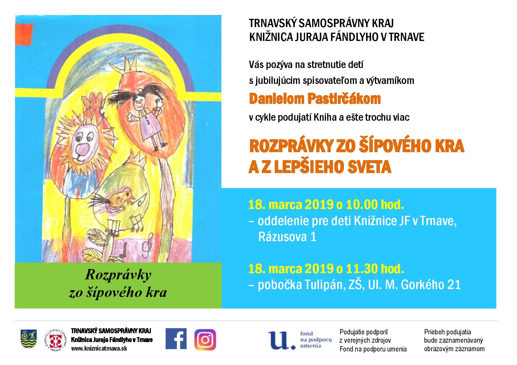 Stretnutie detí s jubilujúcim spisovateľom a výtvarníkom Danielom Pastirčákom v oddelení pre deti Knižnice JF v Trnave o 10.00 hod. a v pobočke Tulipán o 11.30 hod.