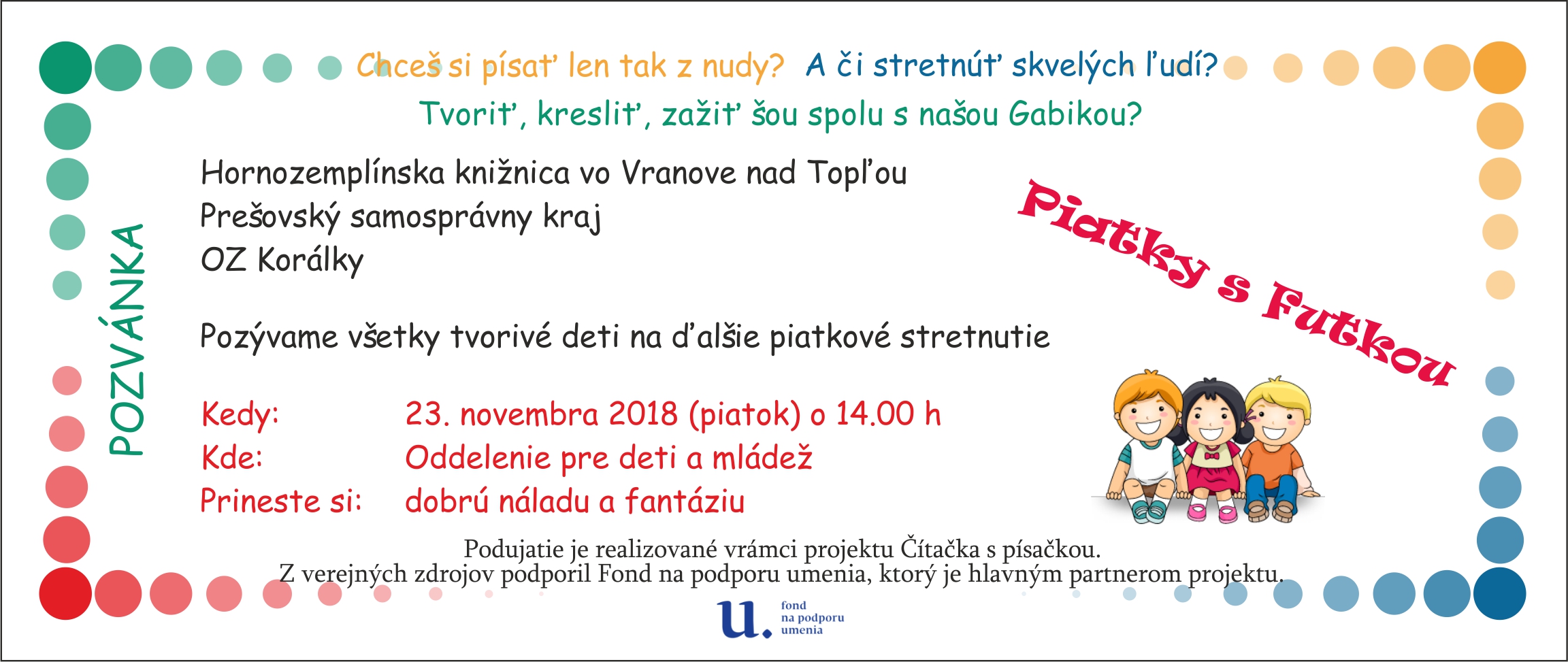 Hlavným zámerom projektu Čítačka s písačkou je rozvoj a podpora čitateľskej gramotnosti, zvýšenie záujmu o knihy, literatúru, zlepšenie jazykových zručností a prejavu. Je určený deťom a mládeži vranovského regiónu. Novinkou sú stretnutia so známou slovenskou spisovateľkou pre deti a mládež Gabrielou Futovou. Stretnutia, ktorých názov je Piatky s Futkou, by mali byť akýmsi "nakopnutím" v ich literárnej tvorivosti.