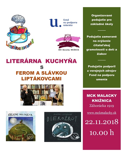 Knižnica MCK Malacky v Literárnej kuchyni namiešala ôsmu jesennú výchovno-vzdelávaciu kašu, ktorá podporuje čitateľskú gramotnosť, čiže trávenie kníh u detí a mládeže a ich záujem o literatúru.Pripravili sme pre žiakov organizované stretnutie s manželmi Liptákovcami. Ich spoločné diela knihy Dierožrút a Chlapec bez mena ilustroval výtvarník a scénograf Fero Lipták a text napísala scenáristka a filmová dramaturgička Slávka Liptáková.