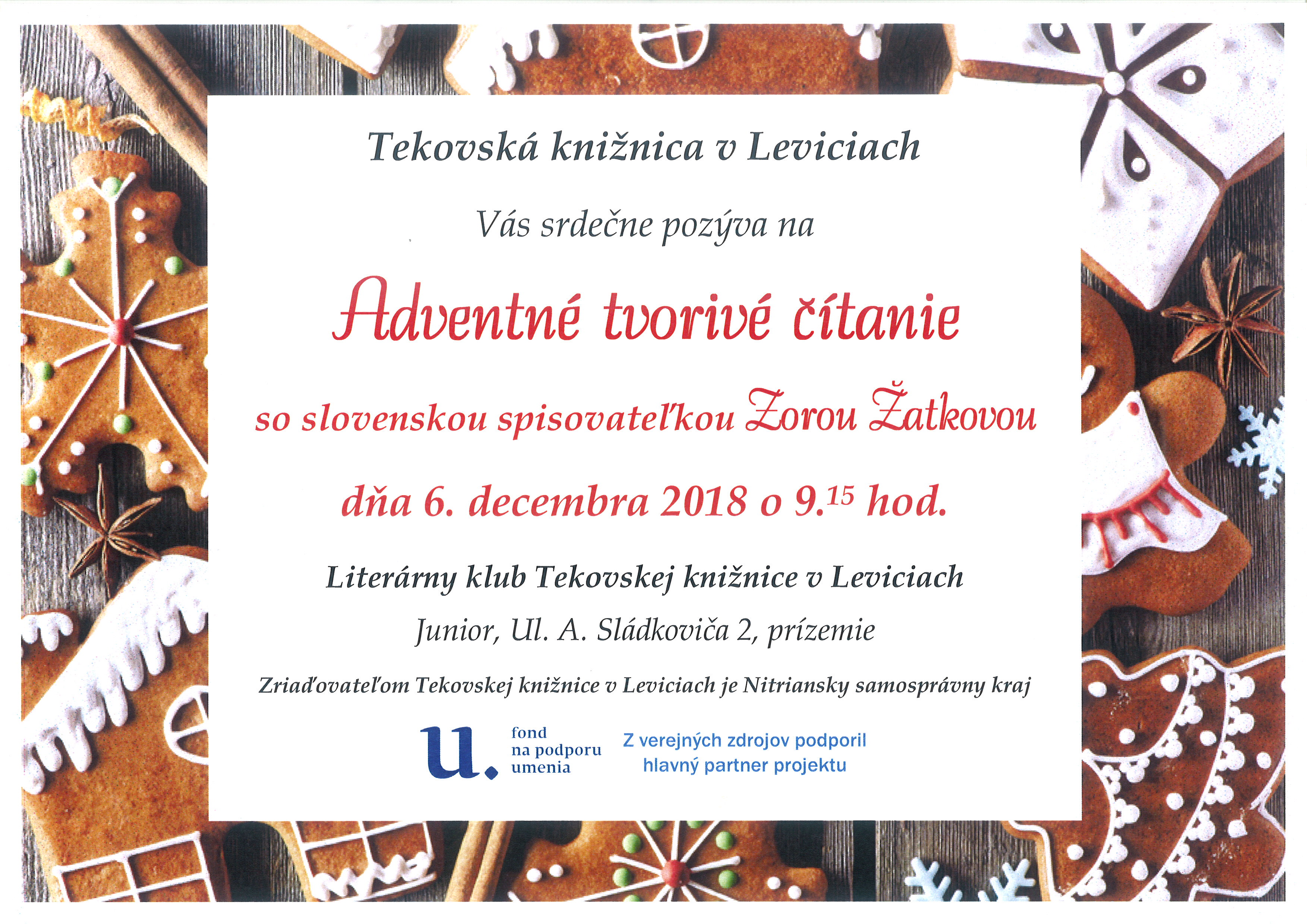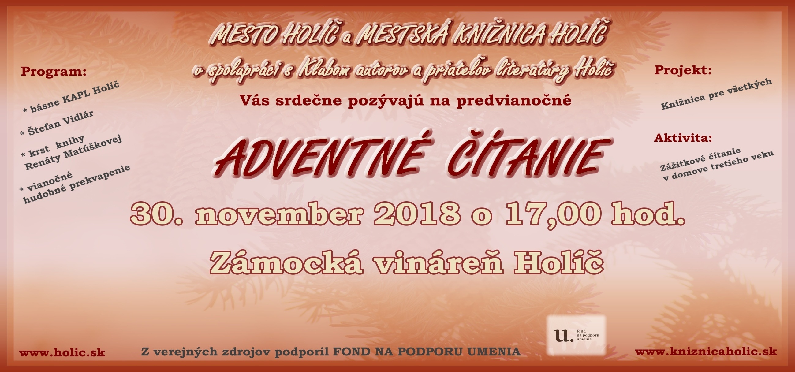 Mesto Holíč a Mestská knižnica Holíč v spolupráci s Klubom autorov a priateľov literatúry Holíč Vás srdečne pozývajú na predvianočné Adventné čítanie, ktoré sa uskutoční dňa 30.11.2018 o 17.00 hod. v priestoroch Zámockej vinárne v Holíči.
