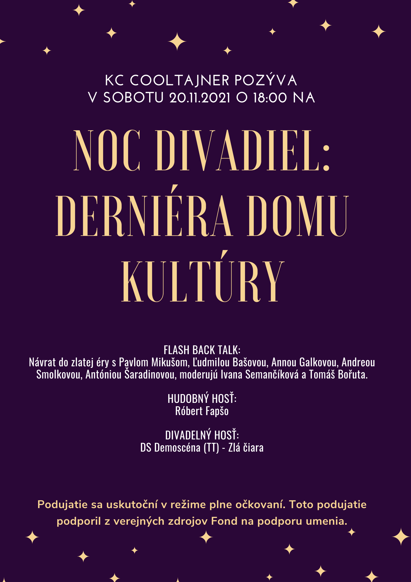 KC Cooltajner pozýva na Noc Divadiel 2021 s podtitulom Derniéra domu kultúry, ktorá sa uskutoční v sobotu 20.11.2021 o 18:00.