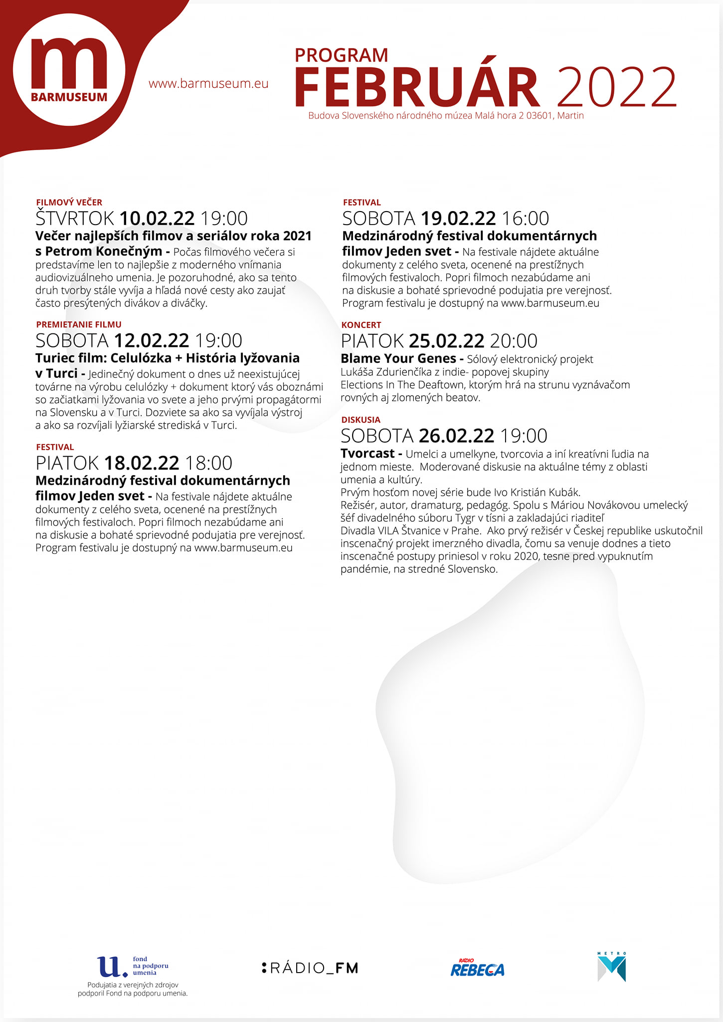 Sólový elektronický projekt Blame Your Genes, festival dokumentárnych filmov Jeden svet či moderovaná diskusia na aktuálne témy z oblasti umenia a kultúry. Týmto a mnoho dalším podujatiam bude patriť február v Barmuseu. Tešíme sa na vás. Podujatia z verejných zdrojov podporil Fond na podporu umenia.