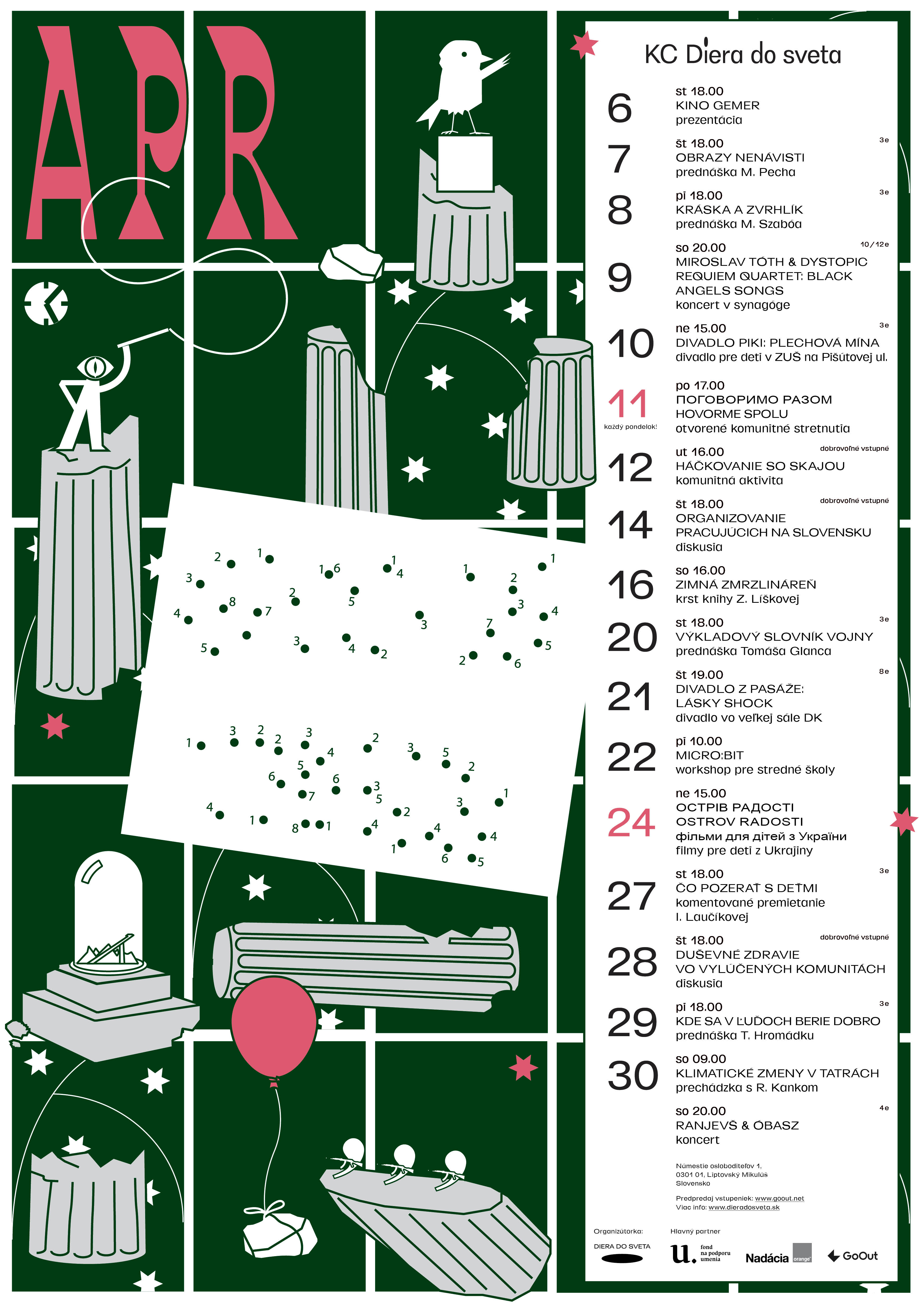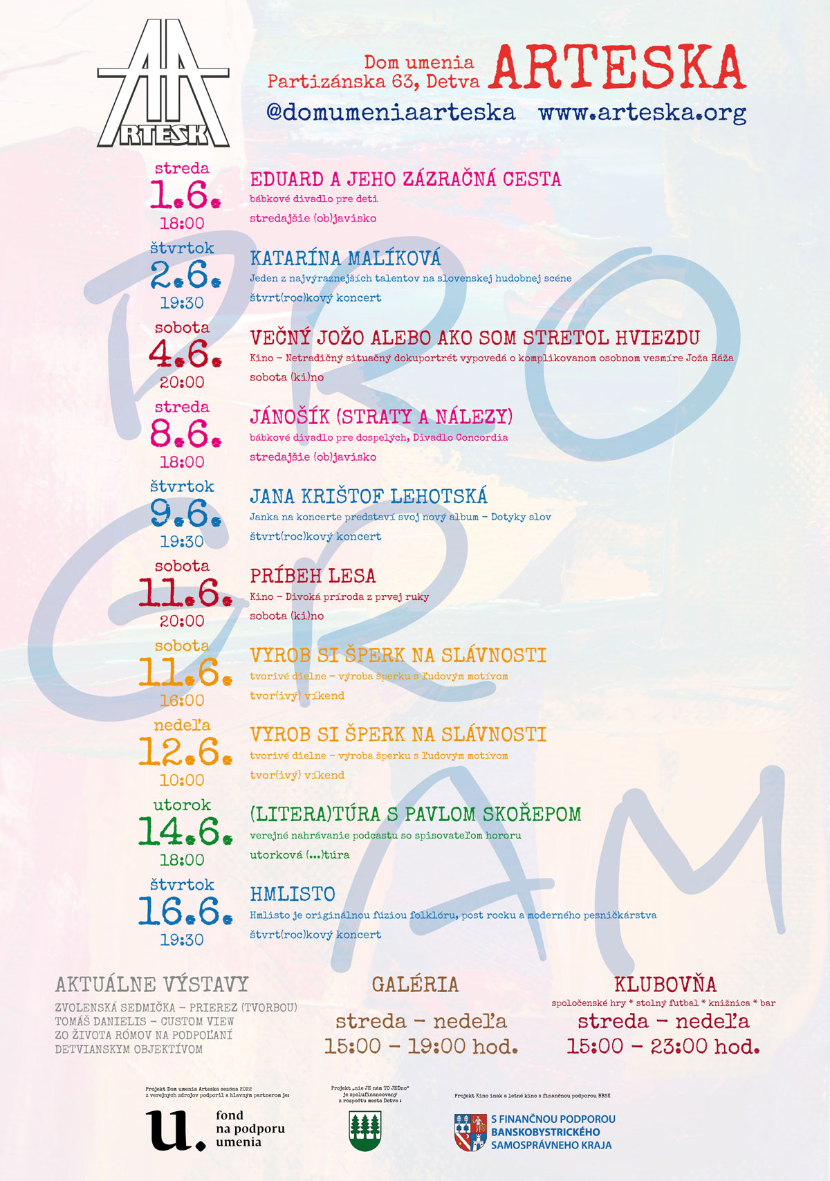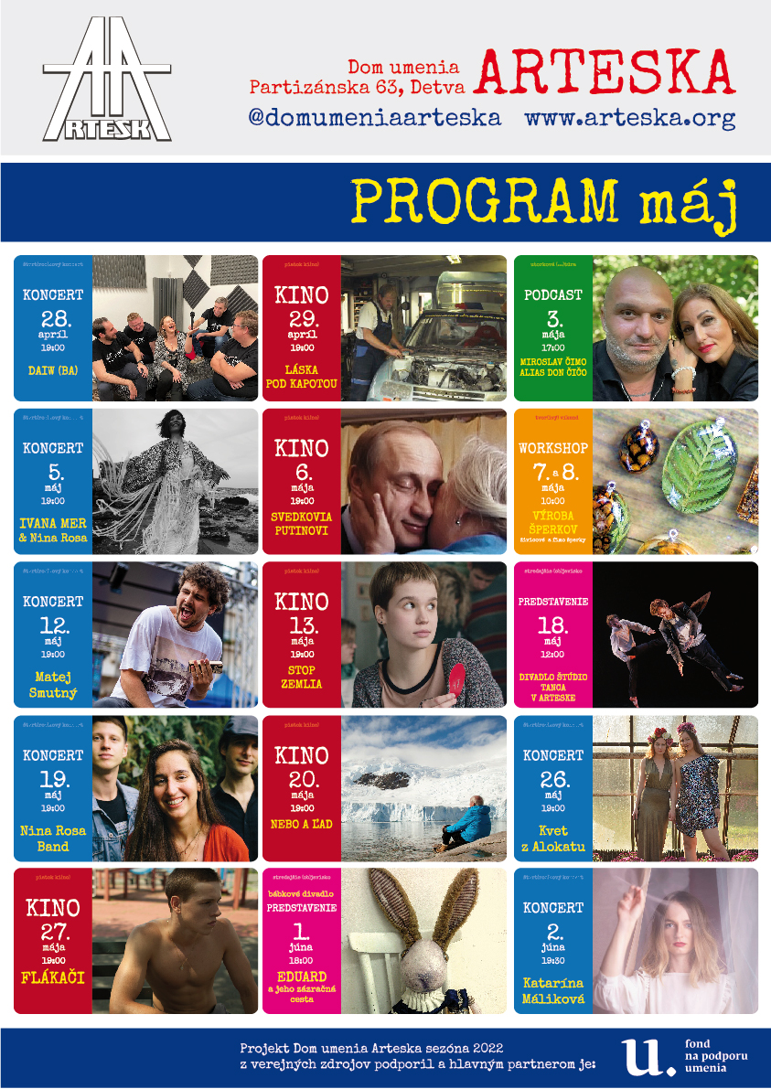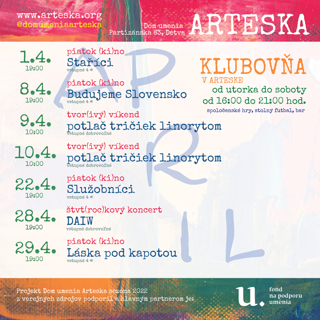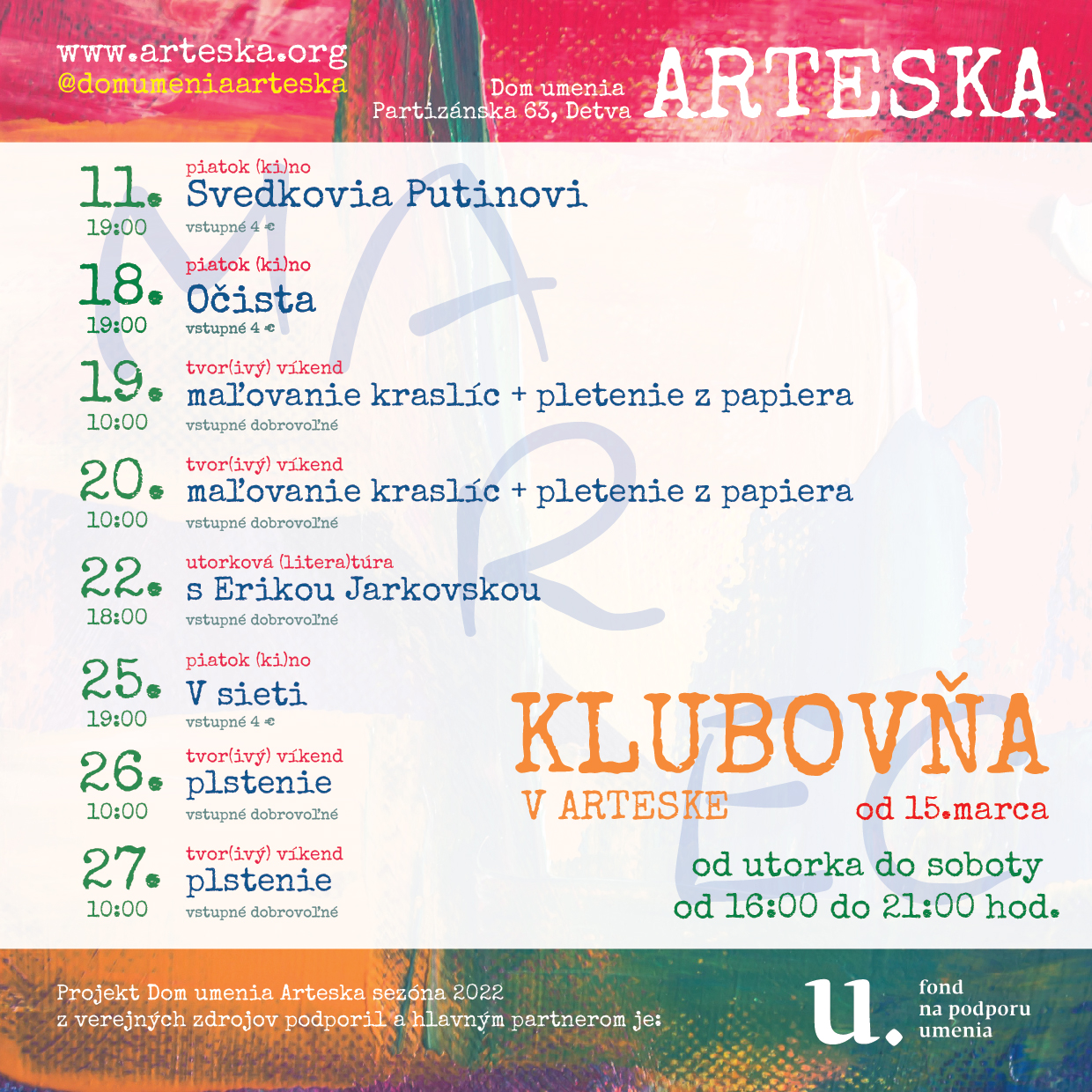 Piatkové kino, víkendové tvorenie, ale aj prvý zo série štvrtkových koncertov v Arteske. Klubovňa ako miesto na hry, kvízy, čitanie a spoločné diskusie na aktuálne témy. Podujatia v Dome umenia Arteska z verejných zdrojov podporil a hlavným partnerom je Fond na podporu umenia.