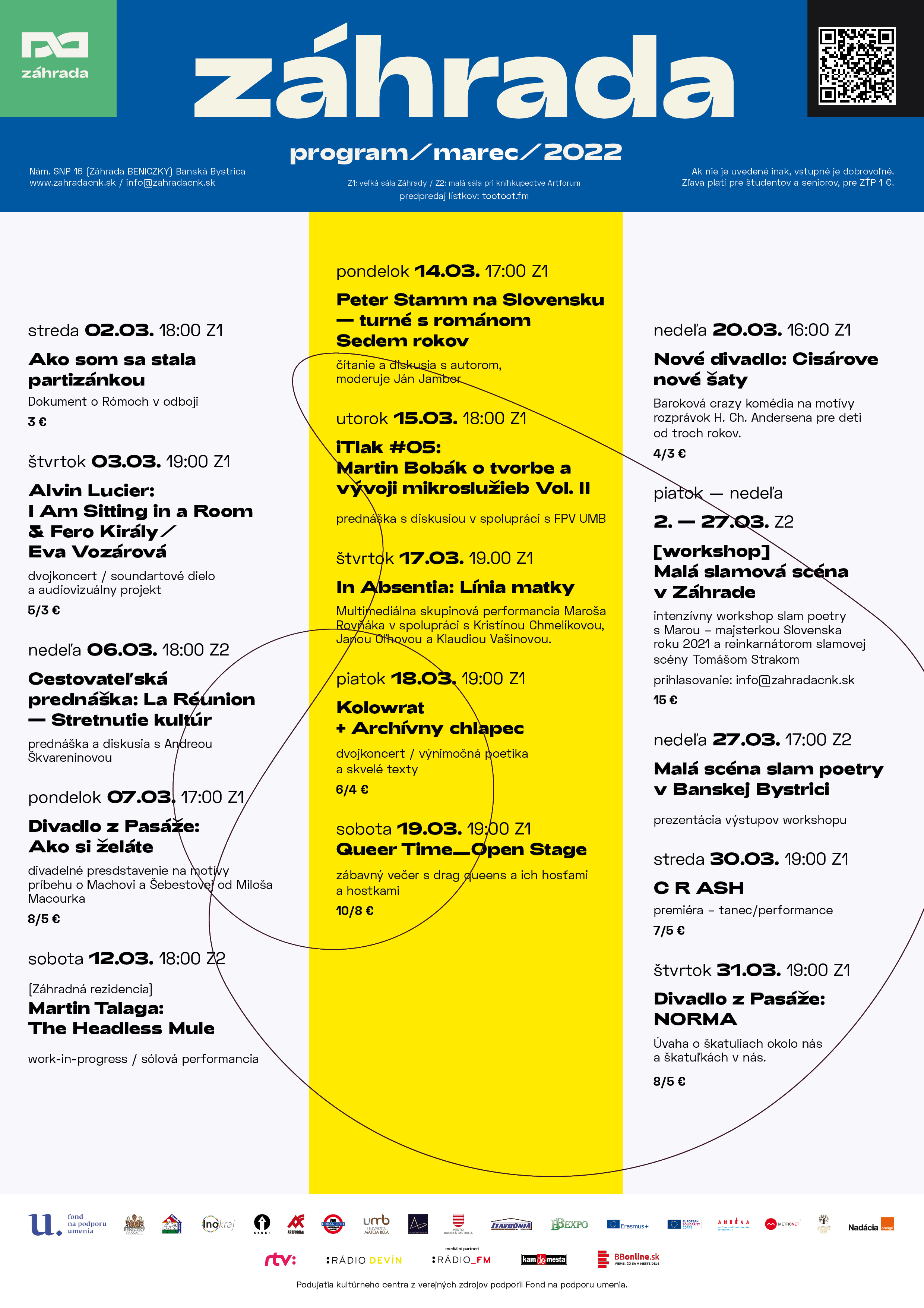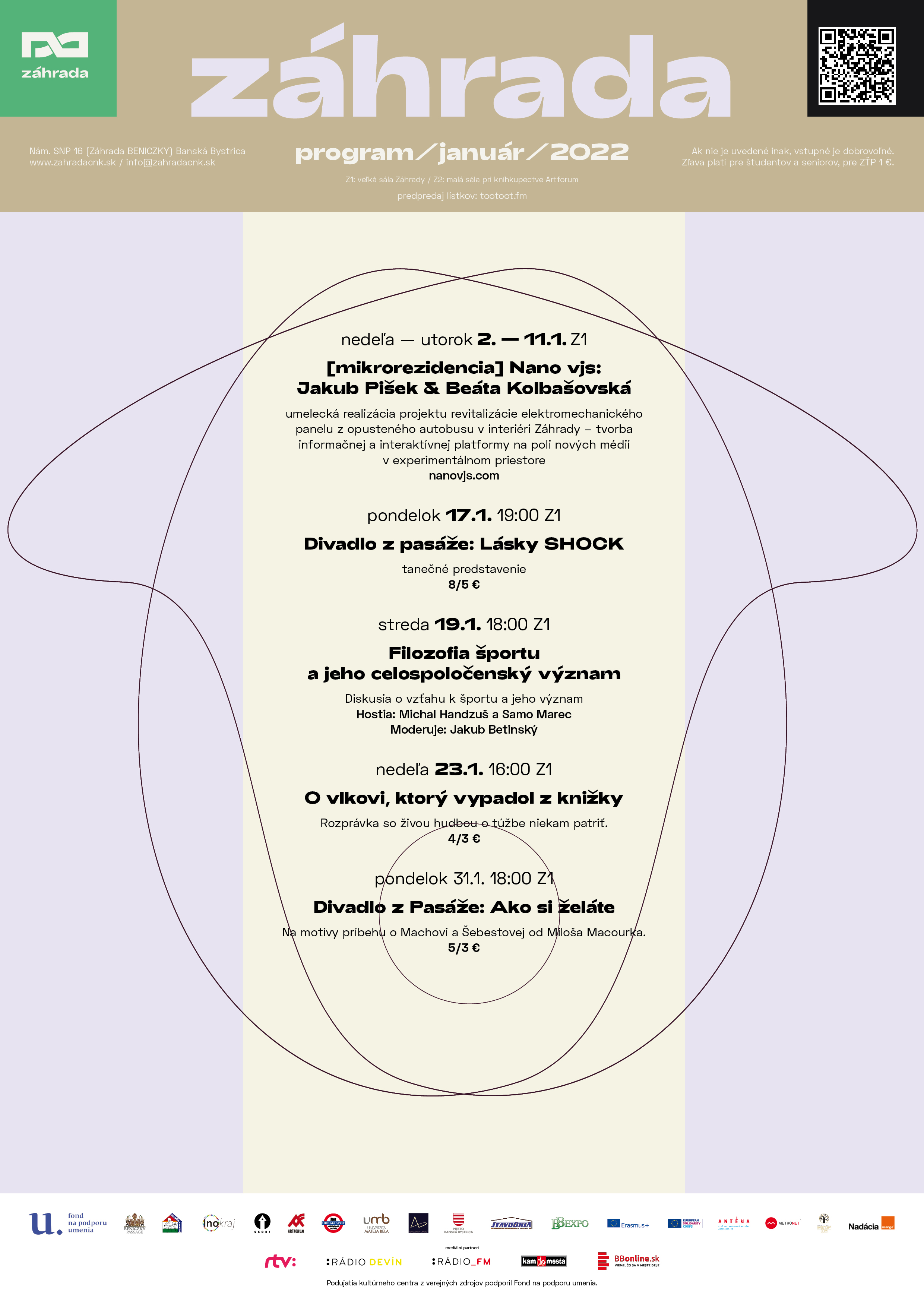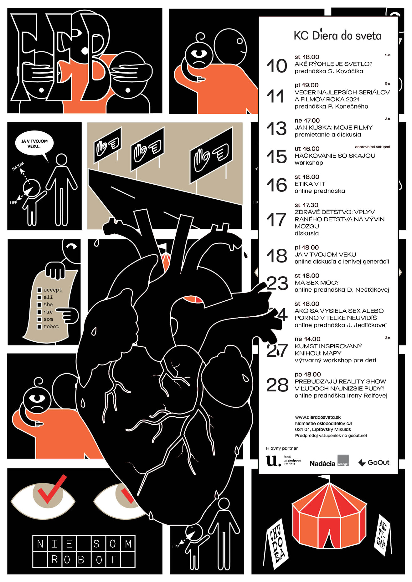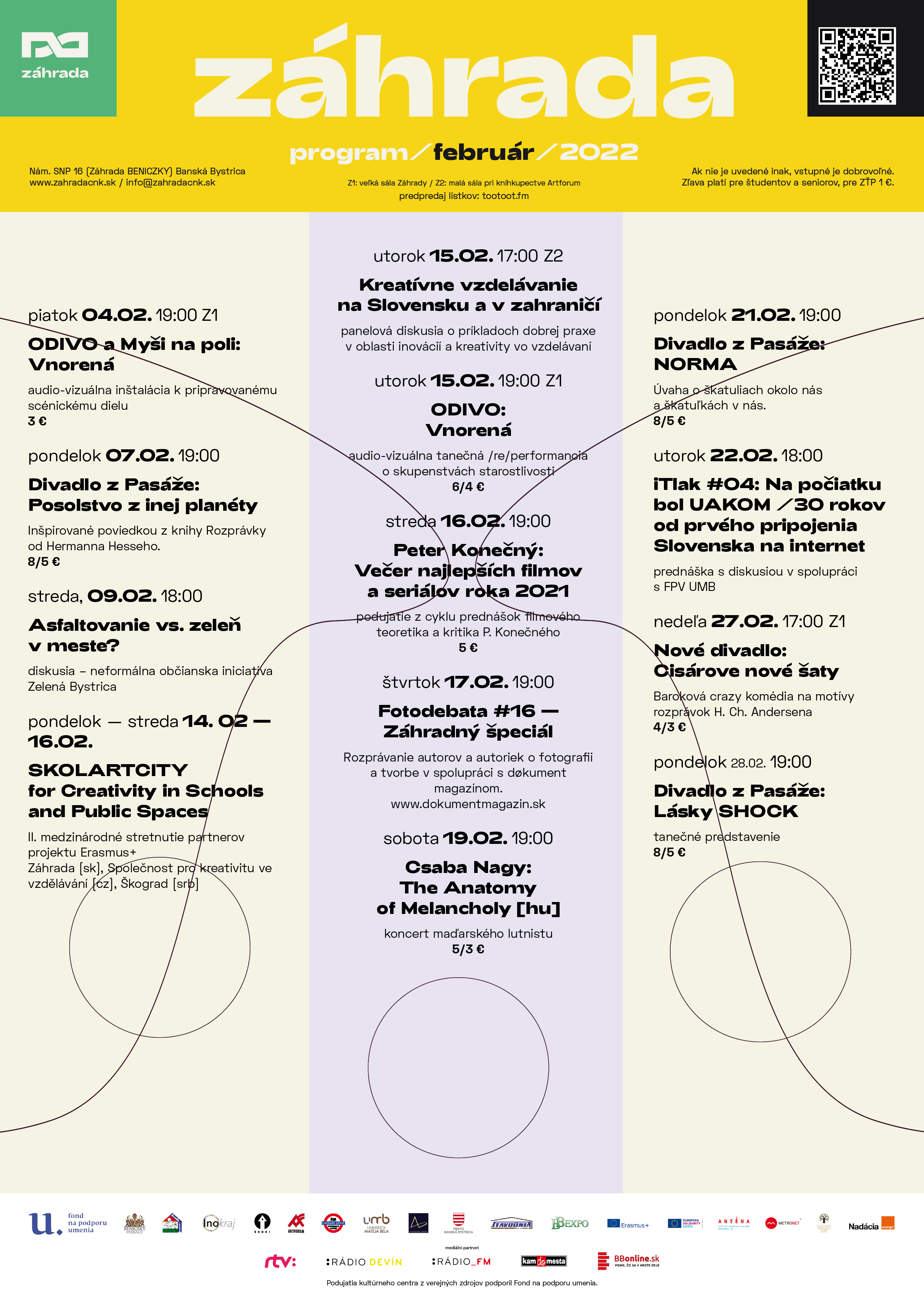 Piatkové kino, víkendové tvorenie, ale aj prvý zo série štvrtkových koncertov v Arteske. Klubovňa ako miesto na hry, kvízy, čitanie a spoločné diskusie na aktuálne témy. Podujatia v Dome umenia Arteska z verejných zdrojov podporil a hlavným partnerom je Fond na podporu umenia.