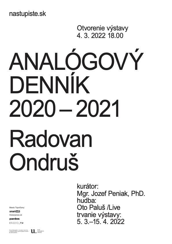 Multimediálny priestory pre súčasnú kultúru Nástupište 1-12, podchod AS Topoľčany srdečne pozýva na otvorenie výstavy: Autor: Radovan Ondruš Názov: Analógový denník Kurátor: Mgr. Jozef Peniak, PhD. 5.3.-15.4.2022 Otvorenie výstavy 4.3.2022 o 18:00
