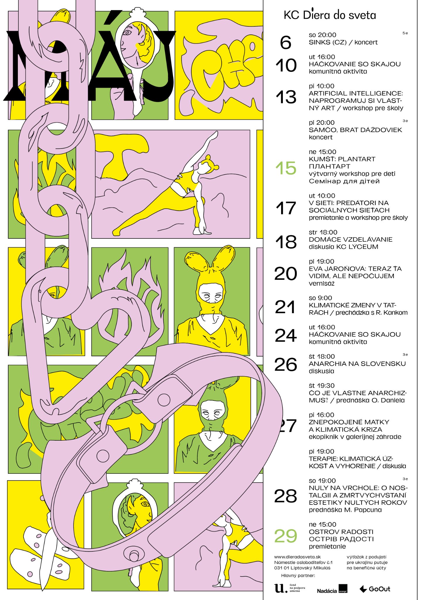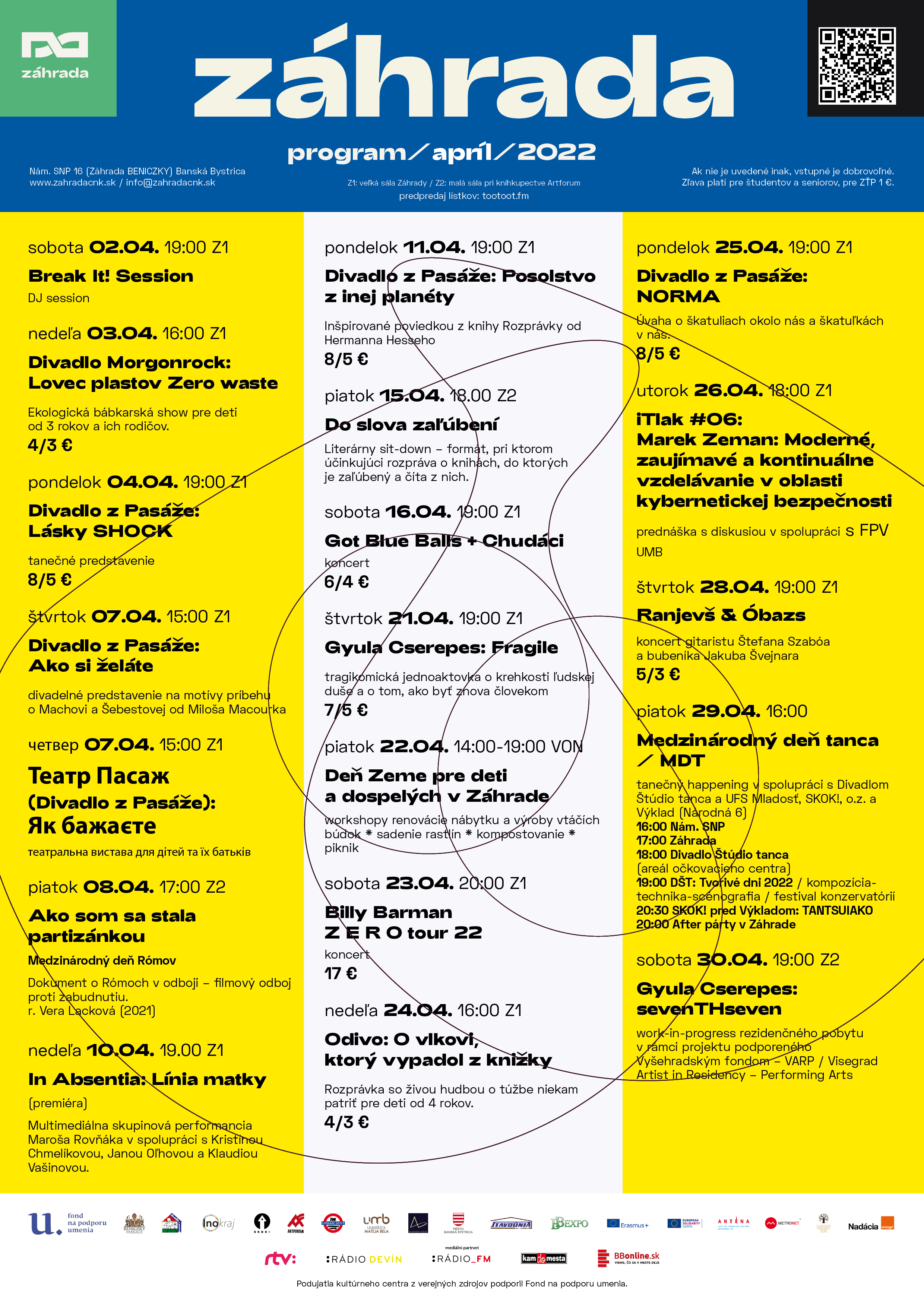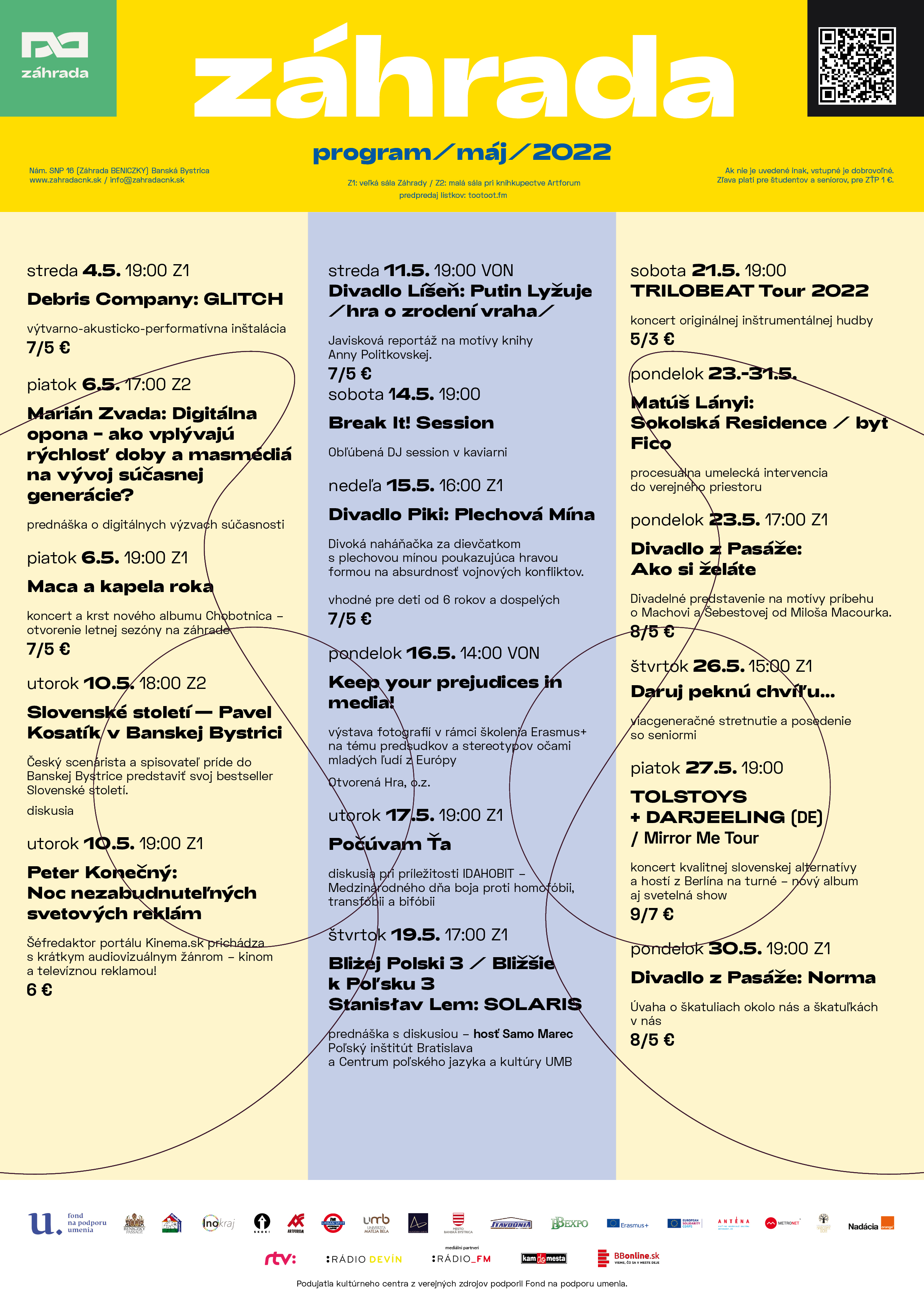 Utorkové podcasty, stredajšie javisko, štvrtkové koncerty, sobotné kino, tvorivé víkendy a výstavy v Arteske. Klubovňa ako miesto na hry, kvízy, čitanie a spoločné diskusie na témy životného prostredia, ale aj intolerancie. Komunitná záhrada pre všetkých. Podujatia v Dome umenia Arteska z verejných zdrojov podporil a hlavným partnerom je Fond na podporu umenia.