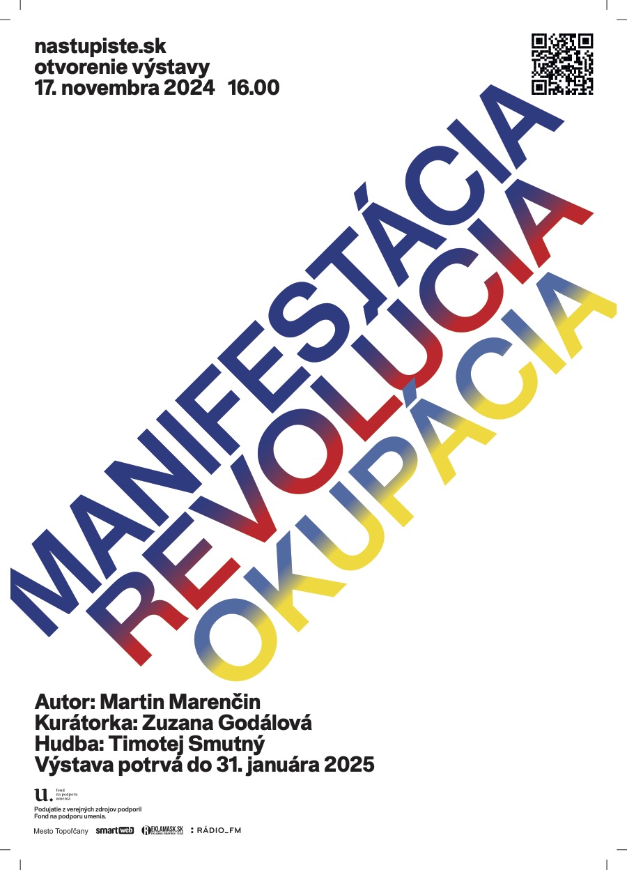 Srdečne pozývame v nedeľu 17.novembra 2024 o 16:00 hod na Nástupište 1-12, podchod AS Topoľčany na otvorenie výstavy Názov : Manifestácia Revolúcia Okupácia Autor: Martin Marenčin Kurátorka: Zuzana Godálová Hudba: Timotej Smutný