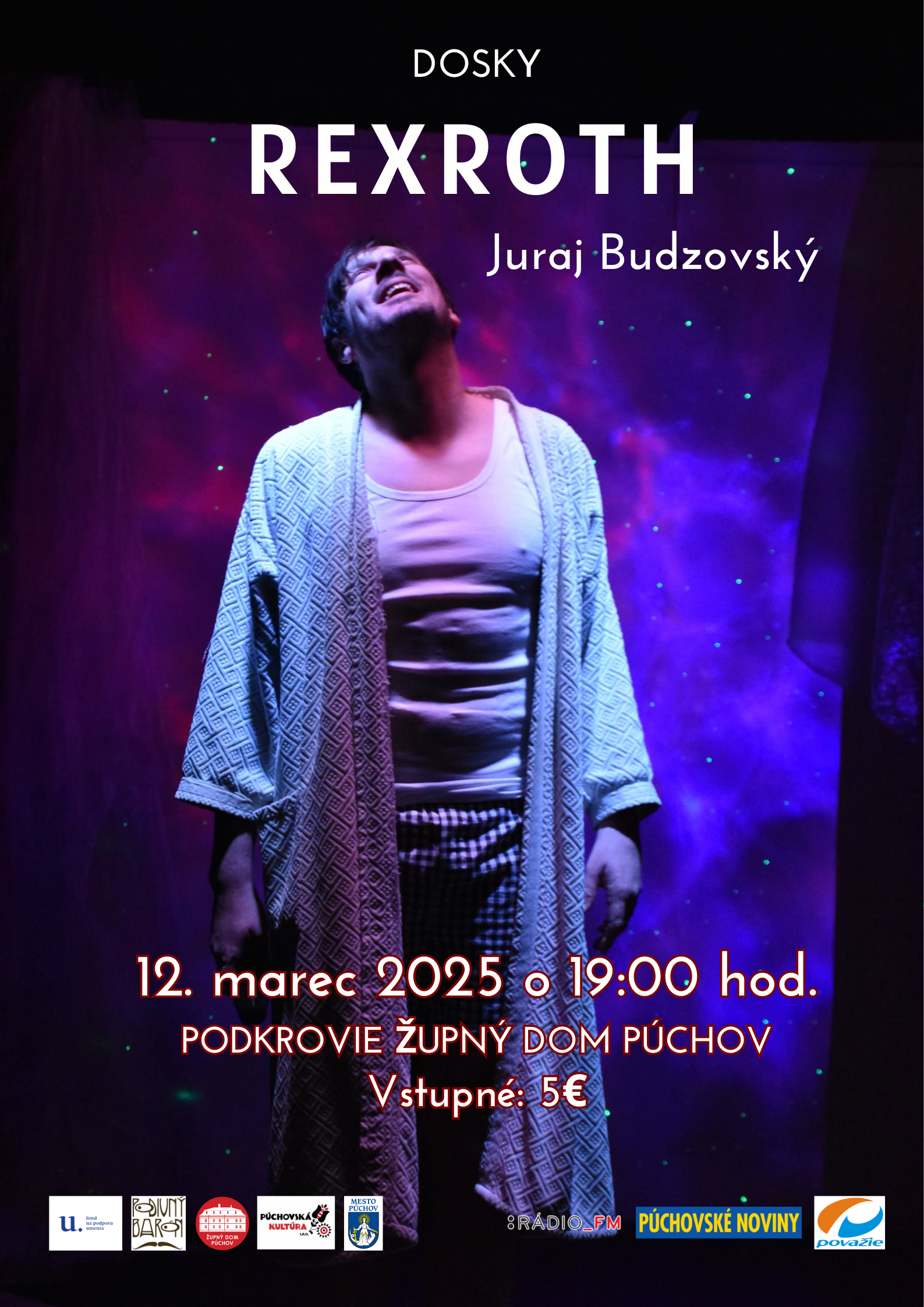 Pozývame vás na monodrámu inšpirovanú životom a dielom Kennetha Rexrotha – vášnivého milovníka prekurzorov a abstraktného pozorovateľa nášho sveta. Slávneho básnika a esejistu – ústrednej postavy Sanfranciskej renesancie – beat generation. Monodrámou vás prevedie herec Juraj Budzovský (Mestské divadlo Trenčín, Mestské divadlo Považská Bystrica).