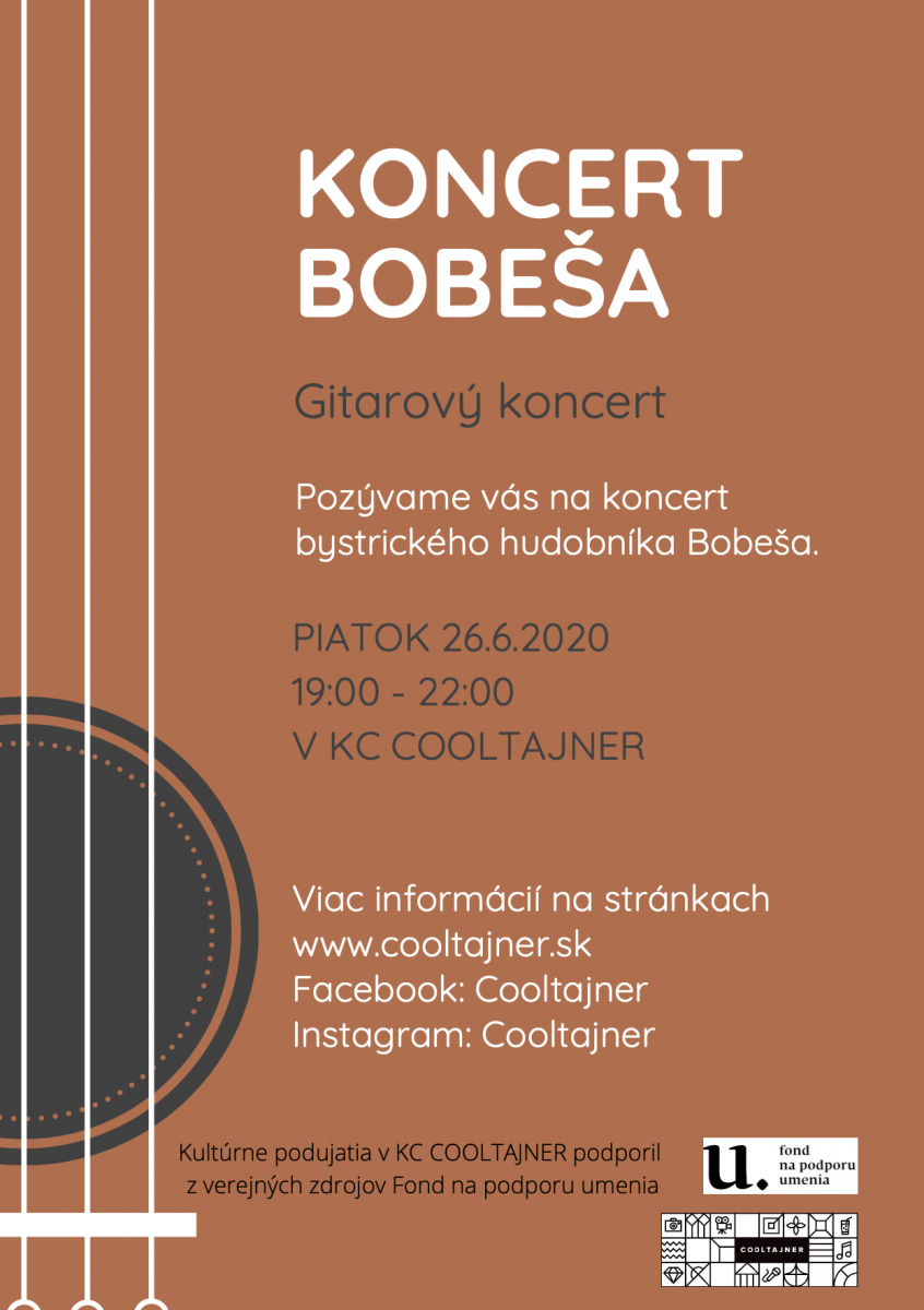 Kultúrne centrum Cooltajner pozýva na jeden z prvých koncertov po pandémii koronavírusu. Gitarový koncert Bobeša si budete môcť vychutnať opäť pri KC Cooltajner už v piatok 26. júna od 19:00 do 22:00. Všetci ste srdečne vítaní!