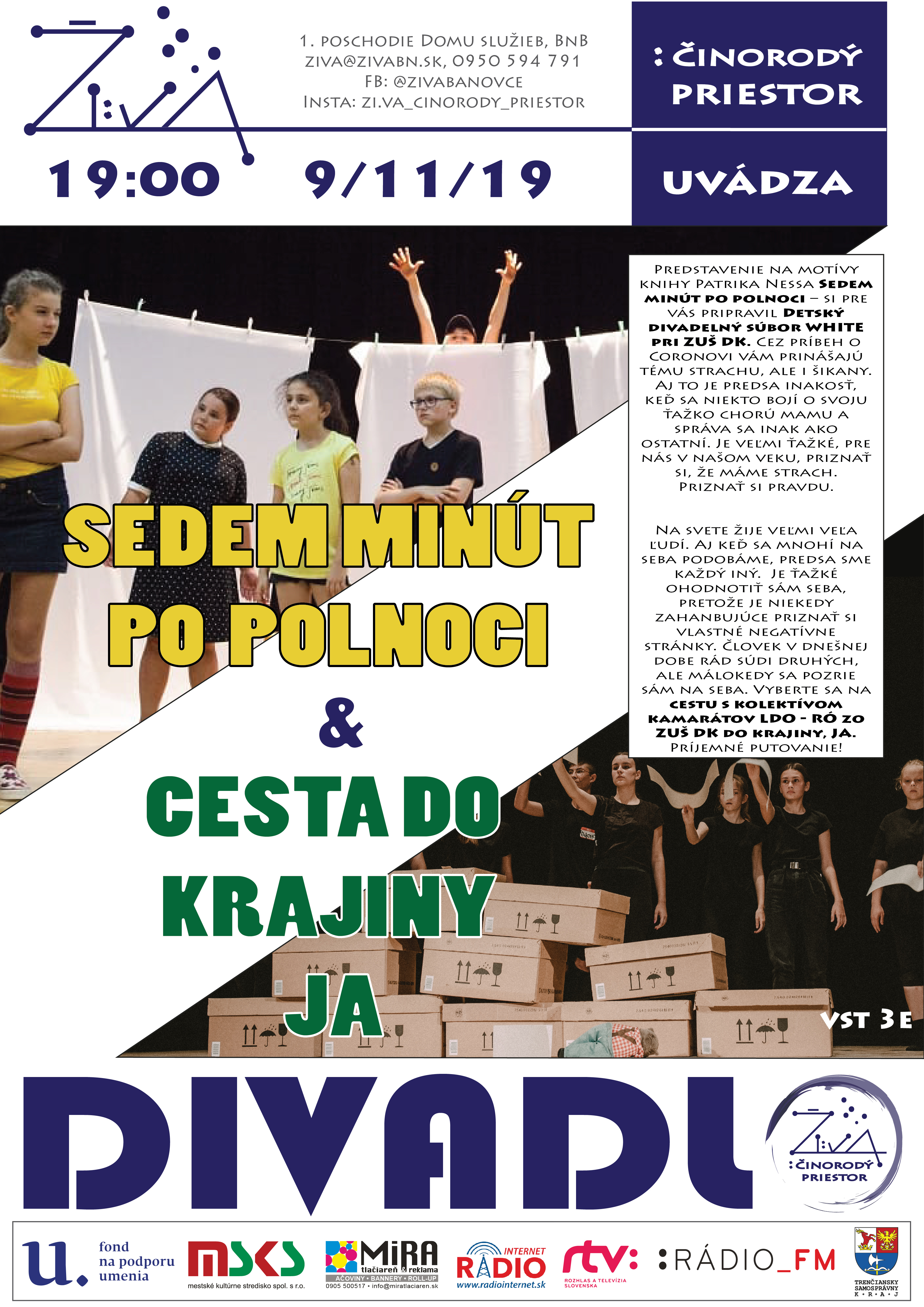 Divadlo: Sedem minút po polnoci & Cesta do krajiny JA sú dve inscenácie divadelných súborov pri ZUŠ D. Kardoša z Bánoviec nad Bebravou, určené pre dospelého diváka. Prvé predstavenie je vytvorené na motívy knihy Patrika Nessa Sedem minút po polnoci a zachytáva tému strachu, ale i šikany. Druhá inscenácia pojedníva o ceste do vlastného vnútra, do uvedomenia si samého seba ako osoby s pozitívnymi i negatívnymi vlastnosťami.