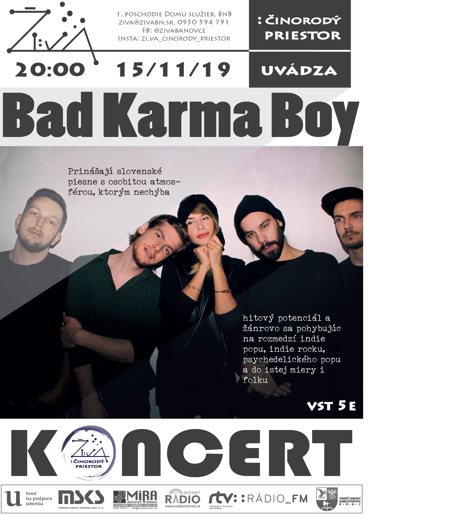 Záver roka sa v našom kultúrnom centre stále nesie v duchu hudby. Tentokrát k nám zavíta skvelá slovenská kapela Bad Karma Boy a my sme nesmierne šťastní, že sa tak stane vďaka podpore Fondu na podporu umenia! Bad Karma Boy je slovenská indie rokovo-popová hudobná skupina pôsobiaca od roku 2013. Svoje kvalitné koncerty obohacuje okrem iného aj o svetelné zážitky, čím sa celkový dojem na diváka znásobuje.
