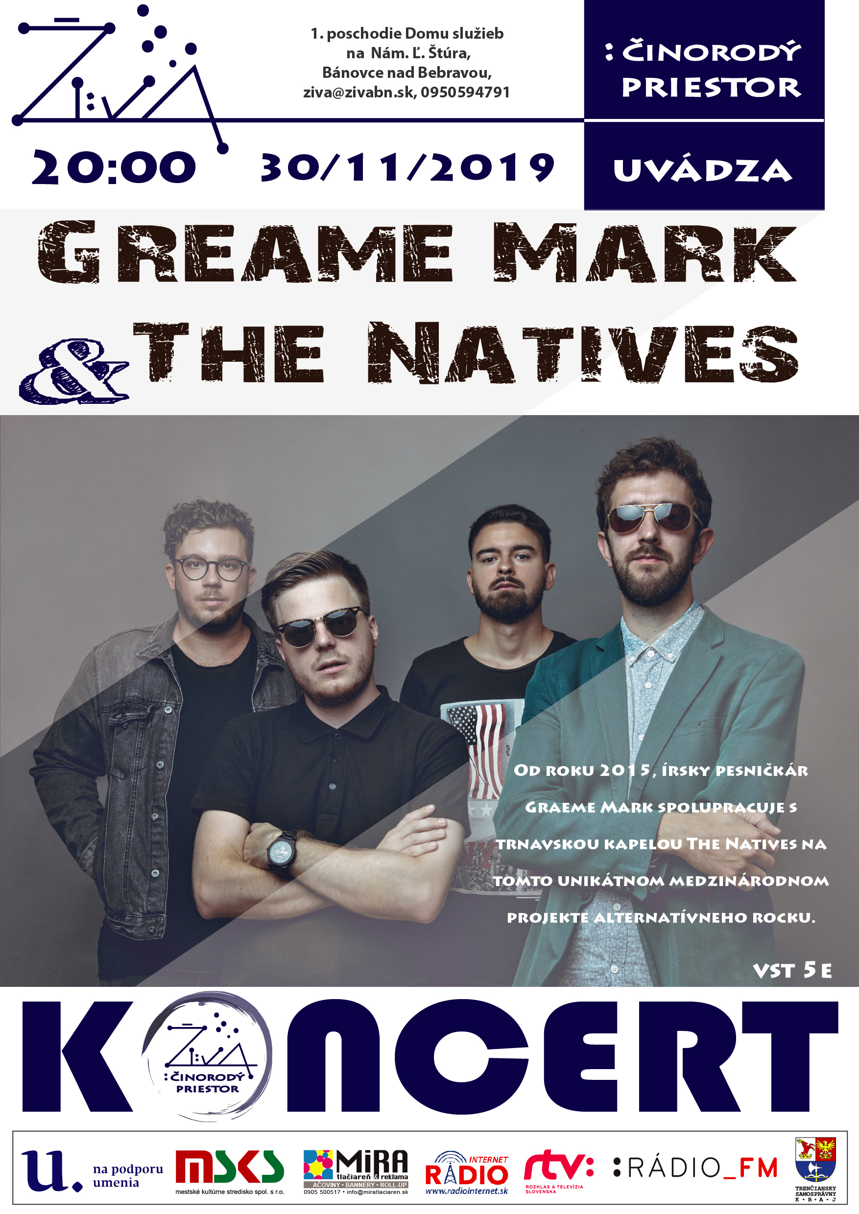 Činodorý priestor Ži:va sa stáva jednou zo zastávok na koncertnej šnúre po Slovensku, ktorú kapela Graeme Mark and the Natives nazvala Makeshift on the road, podľa ich debutového albumu Makeshift. Táto írsko-slovenská skupina okolo speváka a skladateľa Marka prezentuje vlastnú tvorbu, poznačenú indie a folkom. Práve takú, aká ľahodí uchu.