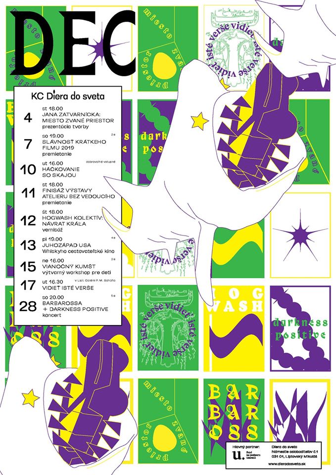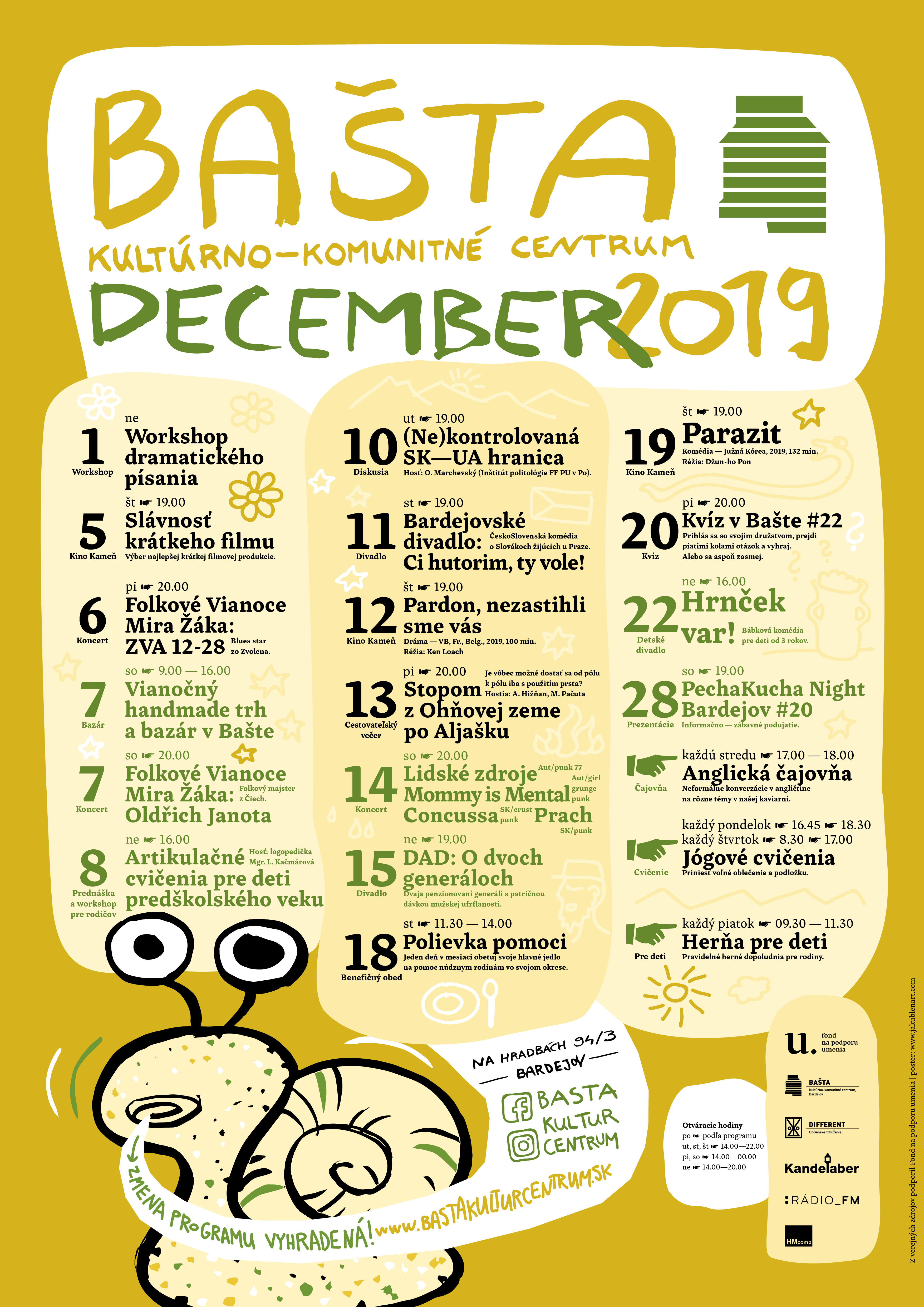 V mesiaci December plánujeme tieto 7 podujatí: 3 performance : 1 z nich zo série 10080 - GND a Bolka, a dve zo série tl;dr - Apart a tl;dr: Ach, ten štastný neštastný rok 2019 (koláž textov), 2 reprízy tanečného predstavenia Autocorrect, prednášku o Musique Non-Stop, Diskusiu s tvorcami - Dokument na kolesách