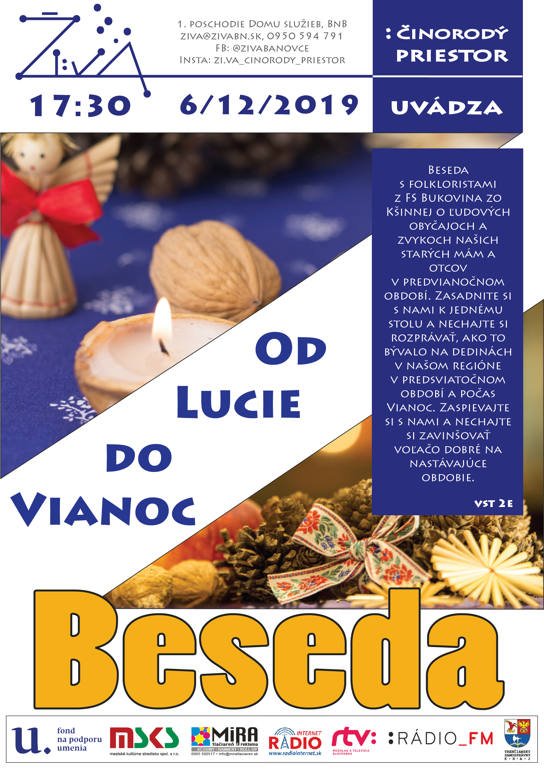 Beseda s folkloristami z FS Bukovina zo Kšinnej o ľudových obyčajoch a zvykoch našich starých mám a otcov v predvianočnom období. Zasadnite si s nami k jednému stolu a nechajte si rozprávať, ako to bývalo na dedinách v našom regióne v predsviatočnom období a počas Vianoc. Zaspievajte si s nami a nechajte si zavinšovať voľačo dobré na nastávajúce obdobie.