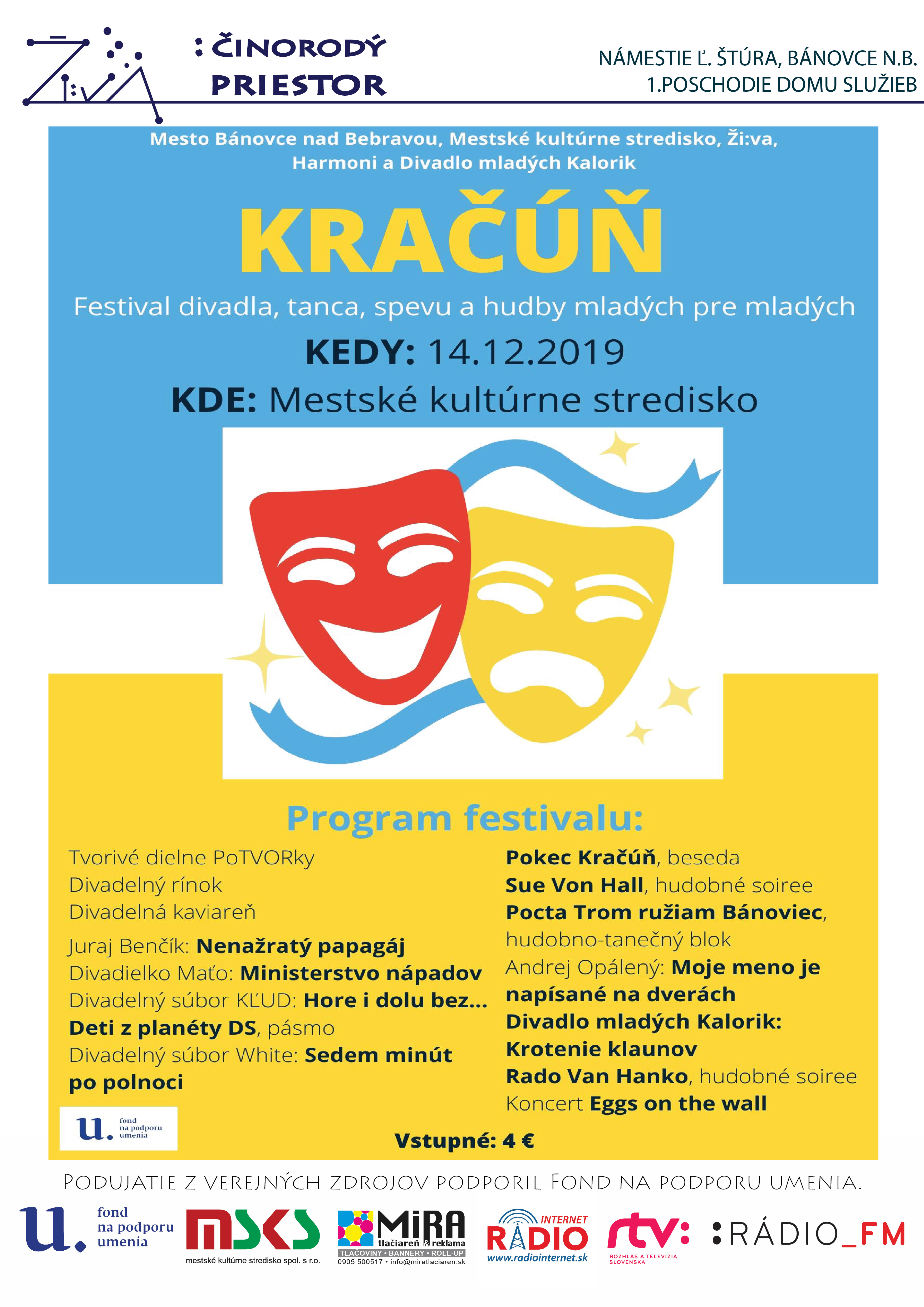 Ži:va sa spája a spolu s inými organizáciami na pôde mesta organizuje Festival Kračúň, v rámci ktorého pripravuje dve divadelné predstavenia. Prezentátormi tentokrát budú : Juraj Benčík s predstavením Nenažratý papagáj a Divadelný súbor KĽUD s hrou Hore i dolu bez... Sme nesmierne radi, že vďaka podpore FPU môžeme širokej verejnosti priniesť ďalšie živé divadelné predstavenia a zážitky s nim spojené.