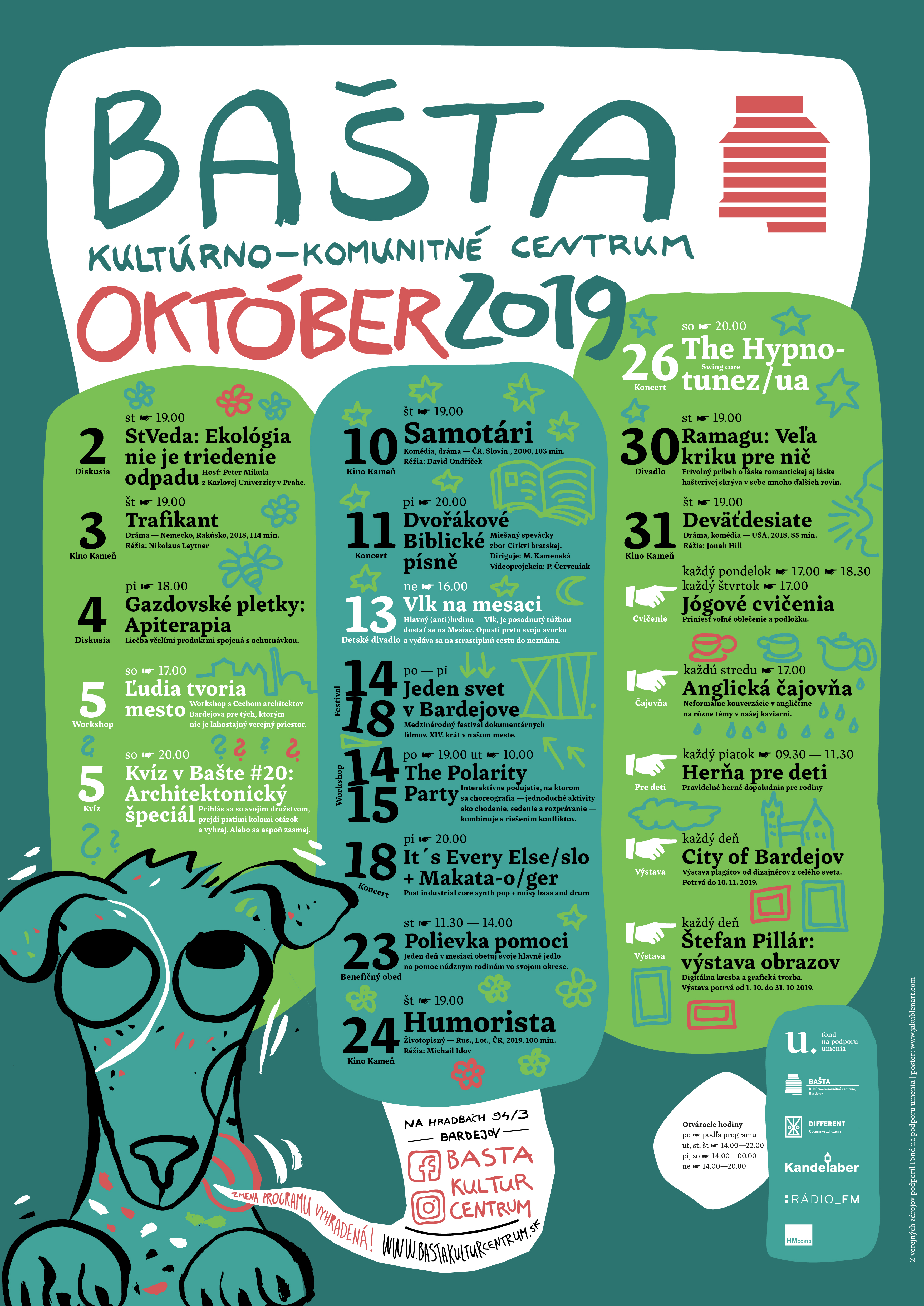 V mesiaci Október plánujeme tieto 4 podujatia:2 performance (10080: Marina Abramovič po sebe neupratuje a 10080: Divadlo Non-Garde) 1 diskusia s tvorcami (Dokument na kolesách: Spýtaj sa vašich 89) a 1 koncert (Deep Dive presents Iron Sight(DK), Chief Bromden(CZ), Shallov(SK), Edúv Syn(SK) )