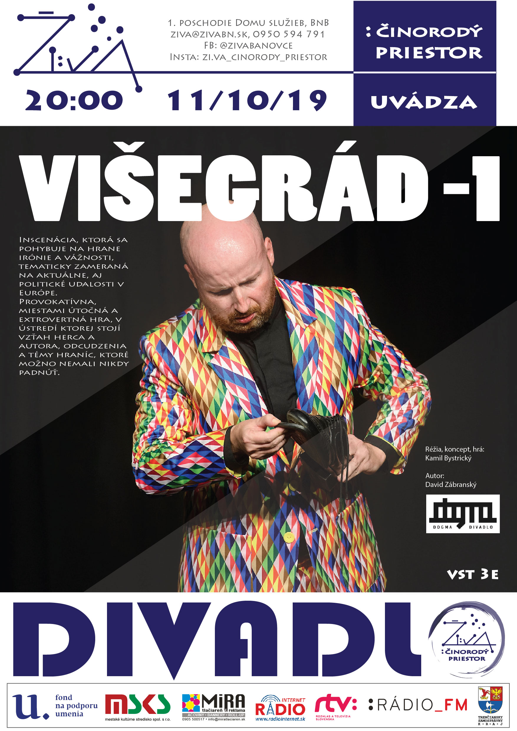 Pôvodne plánované divadelné podujatie, ktoré nemohlo byť uskutočnené 4.mája, pripravujeme spolu s trenčianskym divadlom Dogma na 11.októbra. Predstavenie s názvom Višegrád -1 je svojské vysporiadanie sa herca s autorom na základe dramatizácie textu, ktorý si sám objednal. Provokatívna, útočná a extrovertná monodráma.