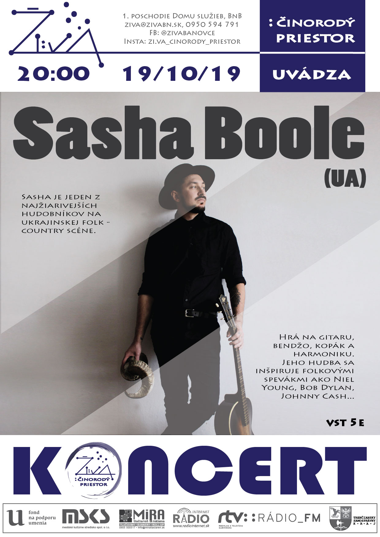 Sasha Boole, jedna z najžiarivejších hviezd na súčasnej ukrajinskej scéne. Textár a interpret hudby štýlu folk a country. Sasha ovláda hru na gitaru, bicie, bendžo a harmoniku. Koncert v Ži:va je súčasťou jeho ďalšej európskej tour!
