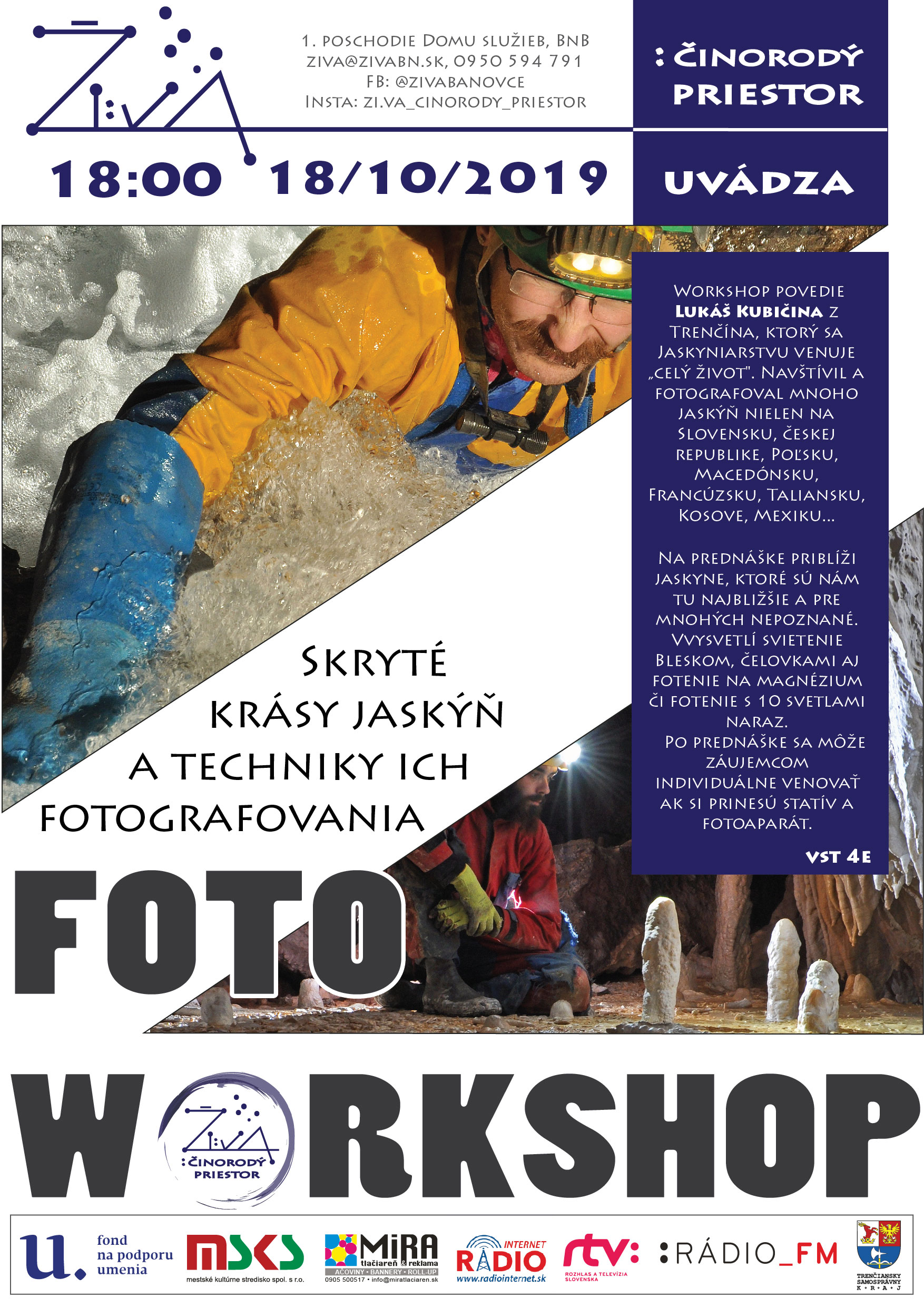 PREDNÁŠKA S PRAKTICKÝMI UKÁŽKAMI :: Sprevádza Lukáš Kubičina, ktorý sa jaskyniarstvu venuje už odkedy si pamätá :) Počas 13 rokov skúšal, učil sa a experimentoval s hrou svetla, tieňa... Navštívil a fotografoval mnoho jaskýň, nielen na Slovensku, ale i v zahraničí. 4. októbra nám zaujímavo odprednáša o jaskyniach a prinesie i vlastnú techniku a vysvetlí svietenie bleskom, čelovkami a aj fotenie na magnézium. Priblíži jaskyne, ktoré sú nám najbližšie a pre mnohých nepoznané.