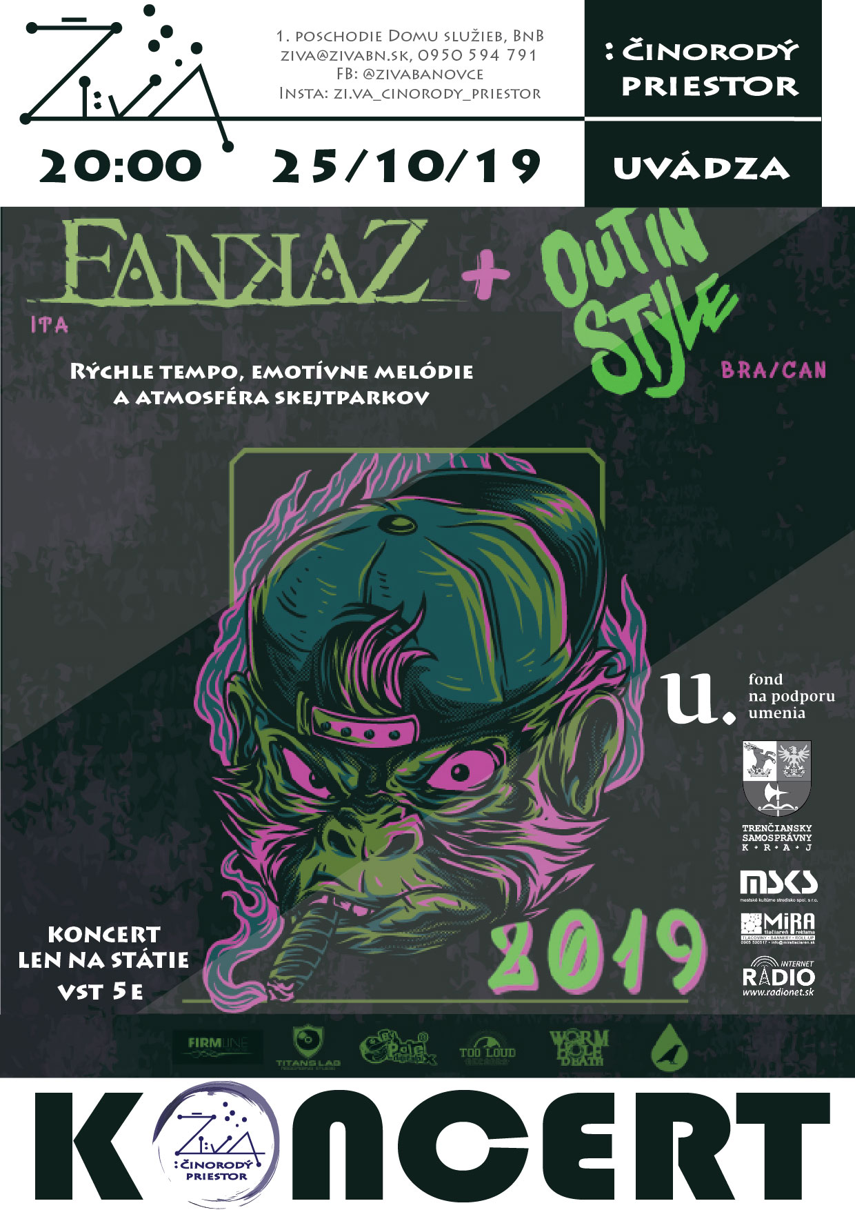 Aj keď brazílskokanadských Out in Style a talianskych Fankaz geograficky delí veľká mláka, hudobne ich spája hudobný žáner skatecore, ktorý prinesú na svojom spoločnom turné (v prípade Fankaz už po tretíkrát) aj na Slovensko. Rýchle tempo, emotívne melódie, naliehavosť a estetika skejtparkov je to, čo definuje hudobnú tvorbu týchto kapiel.