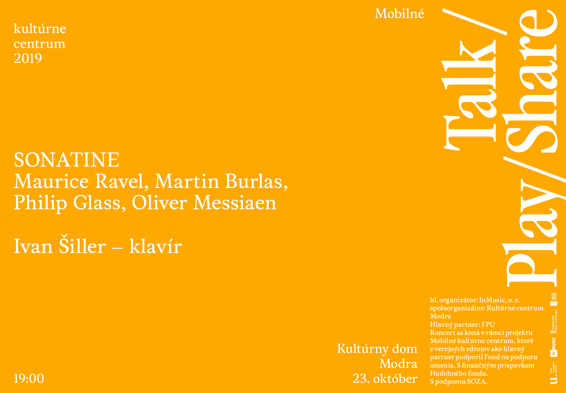 Klavirista Ivan Šiller predstaví v Modre koncertný program s názvom Sonatine. Zaznejú diela Maurica Ravela, Martina Burlasa, Philipa Glassa a Oliviera Messiaena. Pozývame vás na koncert v stredu 23. októbra o 19:00 do Malej sály Kultúrneho domu v Modre.