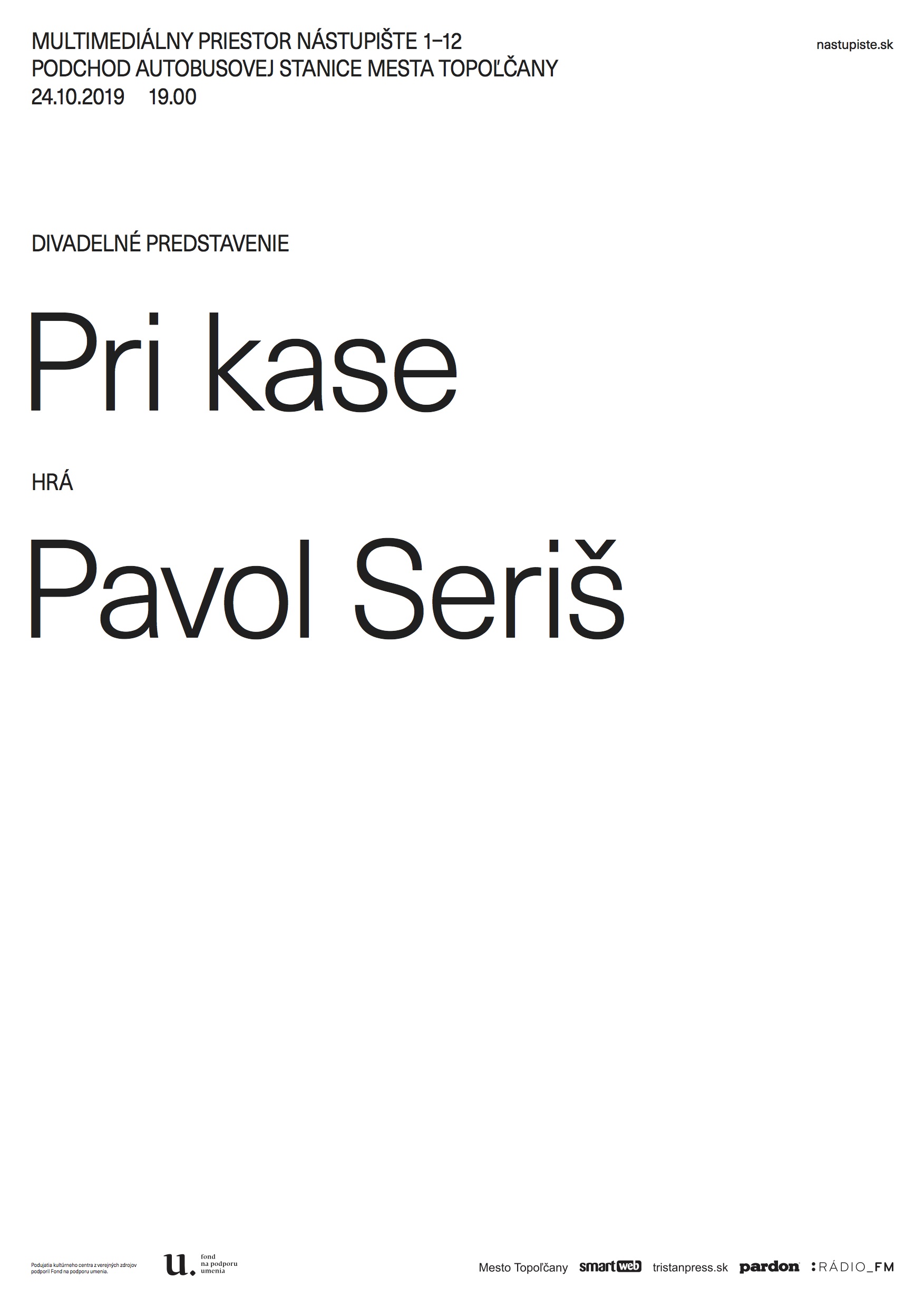 Multimediálny priestor pre súčasnú kultúru Nástupište 1-12 podchod autobusovej stanice v Topoľčanoch pozýva štvrtok 24.10.2019 19:00 Pavol Seriš: Pri kase