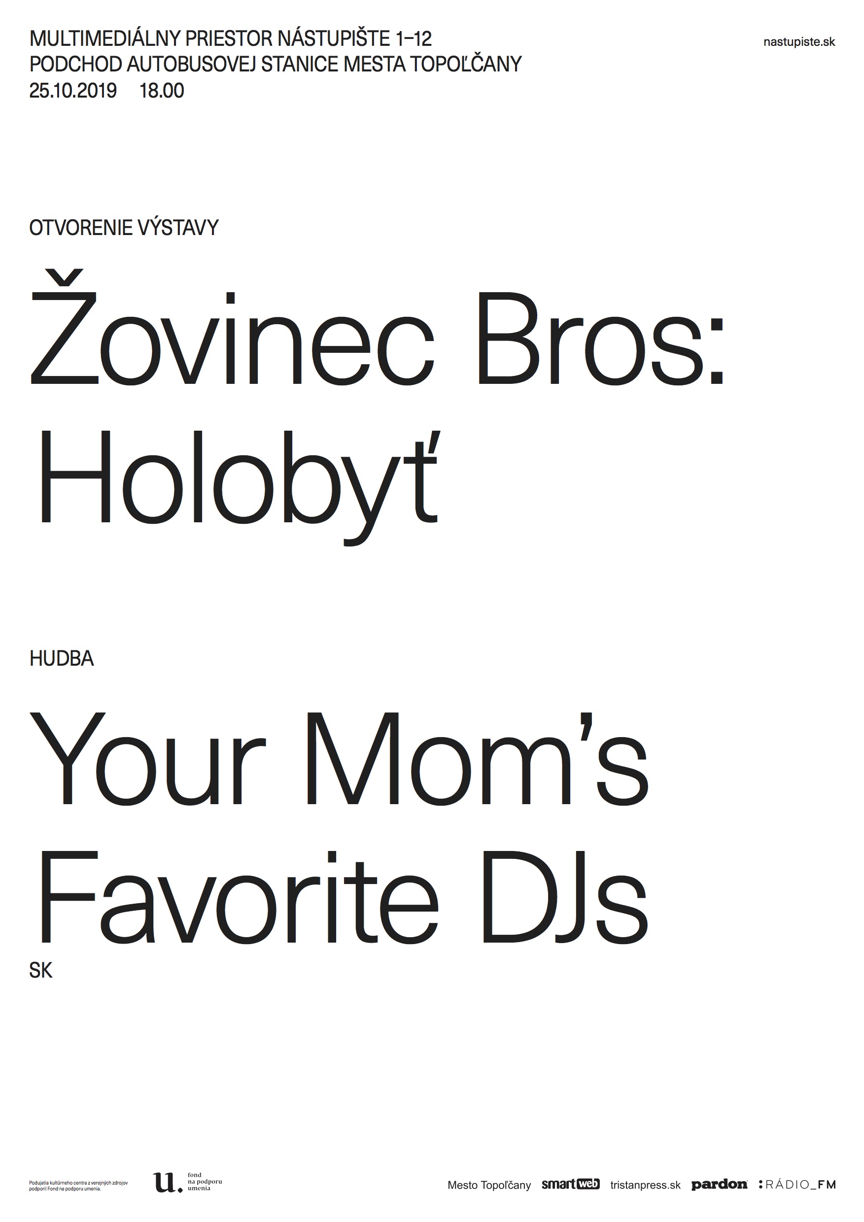 Multimediálny priestor pre súčasnú kultúru Nástupište 1-12 podchod autobusovej stanice v Topoľčanoch pozýva na otvorenie výstavy v piatok 25.10.2019 18:00 Žovinec Bros: HOLOBYŤ Music: Your Mom's Favorite DJs