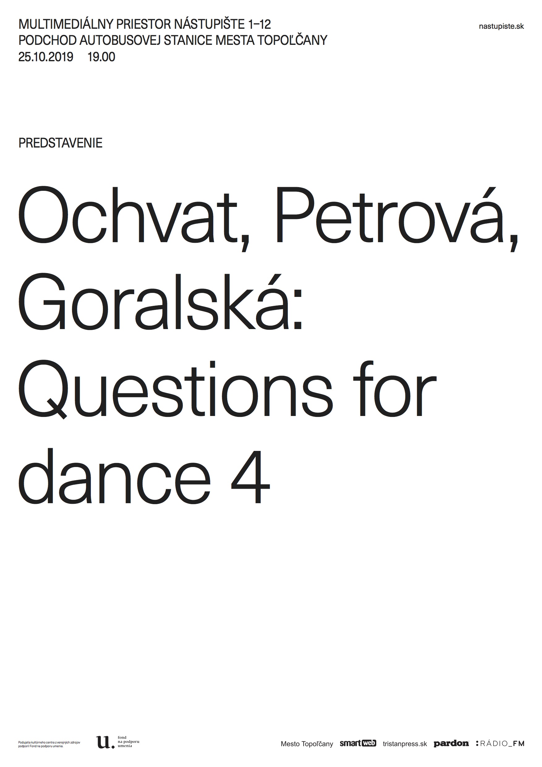 Multimediálny priestor pre súčasnú kultúru Nástupište 1-12 podchod autobusovej stanice v Topoľčanoch pozýva na predstavenie v piatok 25.10.2019 o 19:00 Ochvat/Petrová/Goralská: Questions for dance 4