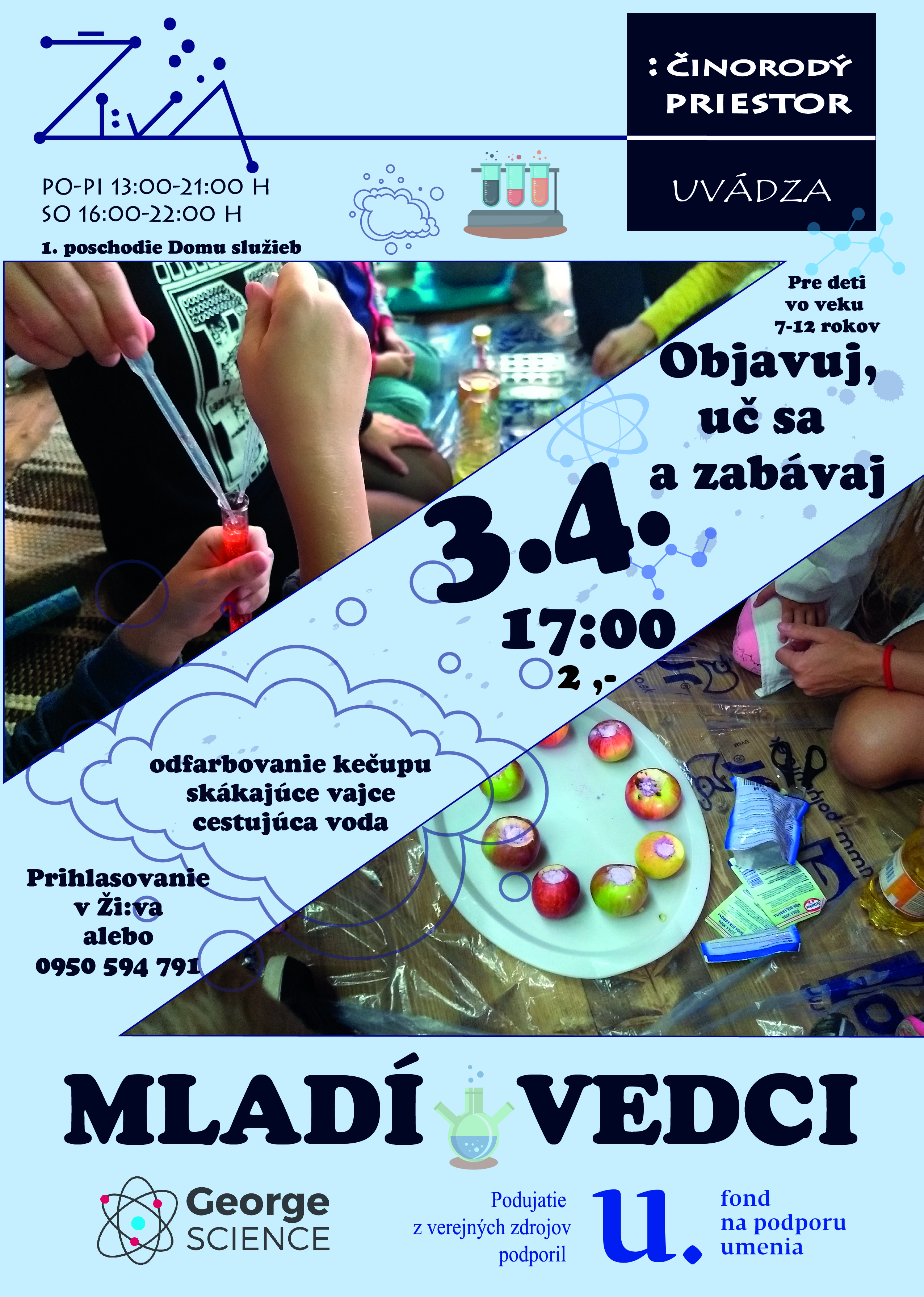 Vedecký workshop, na ktorom sa deti hravou formou zoznamujú s tajomstvami fyziky a chémie. ODFARBOVANIE KEČUPU SKÁKAJÚCE VAJCE CESTUJÚCA VODA Tentokrát pre deti vo veku 7-12 rokov.